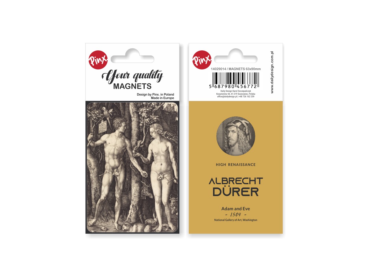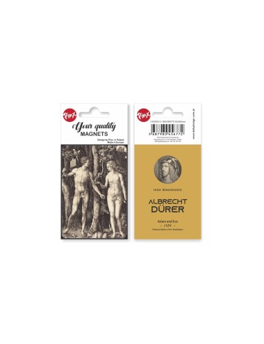 A rectangular magnet inspired by the work of the great painter Albrecht Dürer "Adam and Eve". The magnet is made of high quality materials, covered with a protective film. Packaged in an aesthetically pleasing foil with cardboard box. Dimensions 6,3x9 cm