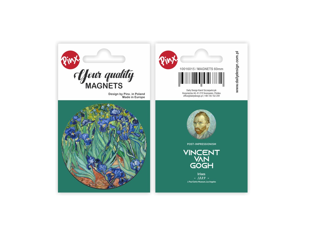 circular magnet inspired by the work of the great painter Vincent Van Gogh "Irises". The magnet is made of high quality materials, covered with a protective film. Packaged in an aesthetically pleasing foil with cardboard box. Dimensions 6,3x9 cm