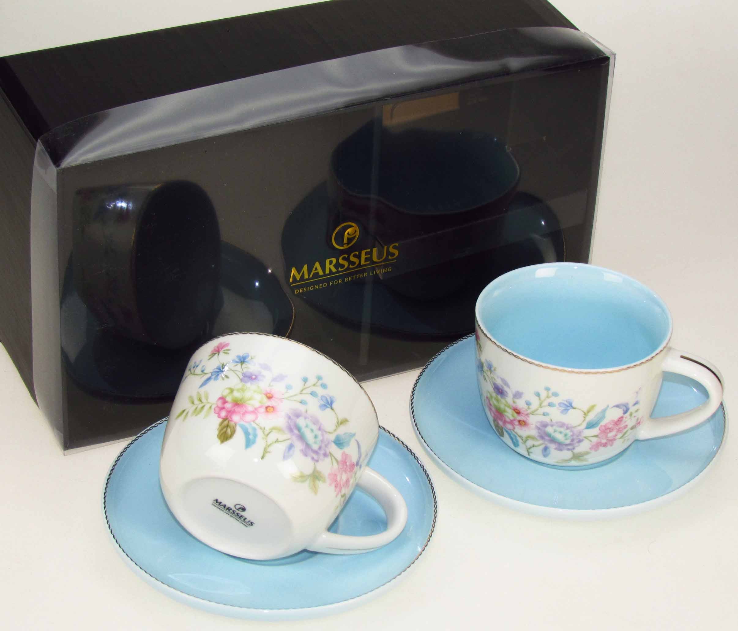 Set of 2 pastel cups with saucers, decorated with a floral motif from the unique Glamour by Marsseus collection. Packaged in a decorative gift box. Capacity 250 ml*2