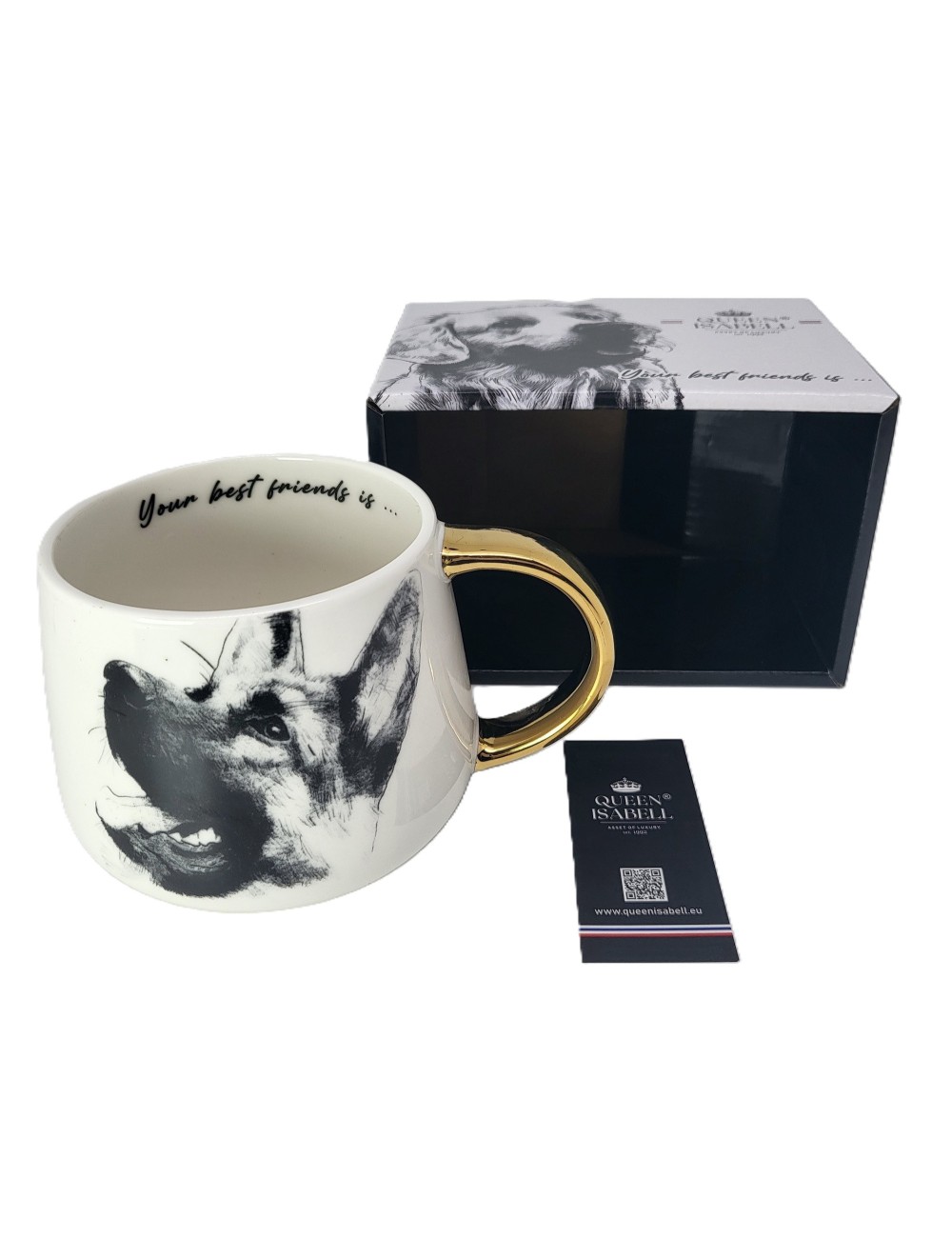 Duży złocony kubek wykonany z porcelany z wizerunkiem psa rasy owczarek niemiecki. Zapakowany w opakowanie prezentowe. Pojemność: 400 ml