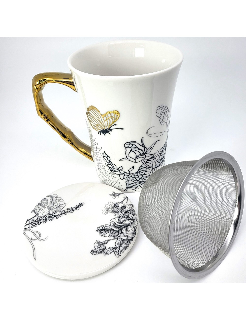 Kubek z zaparzaczem i przykrywką, wykonany z najwyższej jakości porcelany Bone China zdobiony motywem kwiatów i motyli. Zapakowany w opakowanie prezentowe. Pojemność: 350 ml