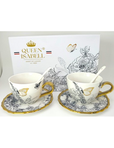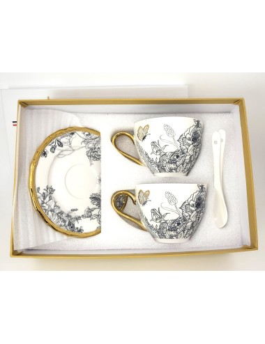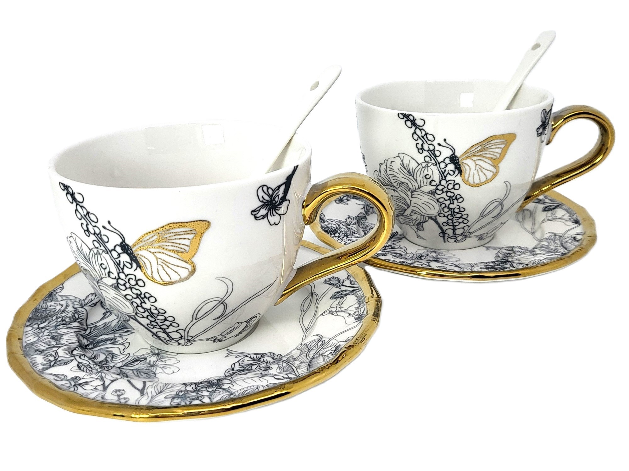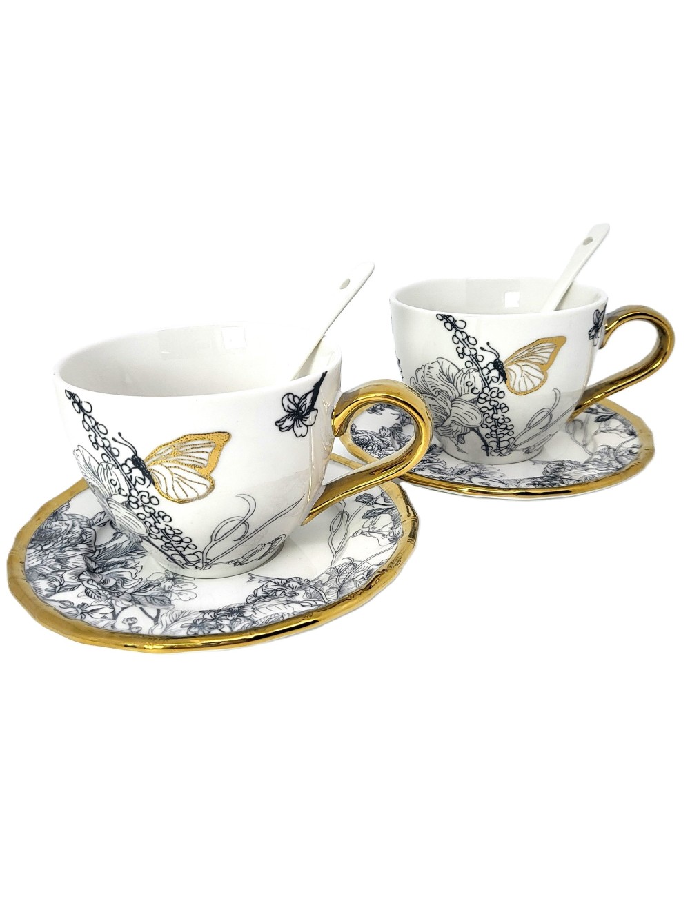 Zestaw eleganckich filiżanek ze spodkami wykonany z najwyższej jakości porcelany Bone China, zdobiony motywem kwiatów i motyli. Zapakowany w opakowanie prezentowe. Pojemność: 200 ml*2
