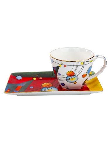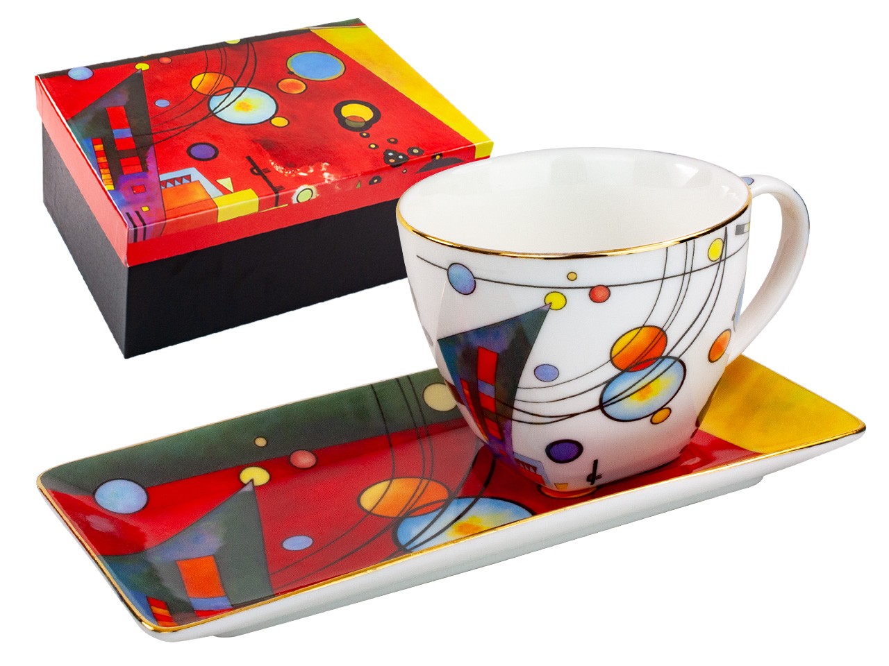 Elegancka filiżanka ze spodkiem inspirowana abstrakcyjnymi dziełami wielkiego malarza Kandinsky'ego. Zapakowana w ozdobne opakowanie prezentowe. Pojemność 250 ml