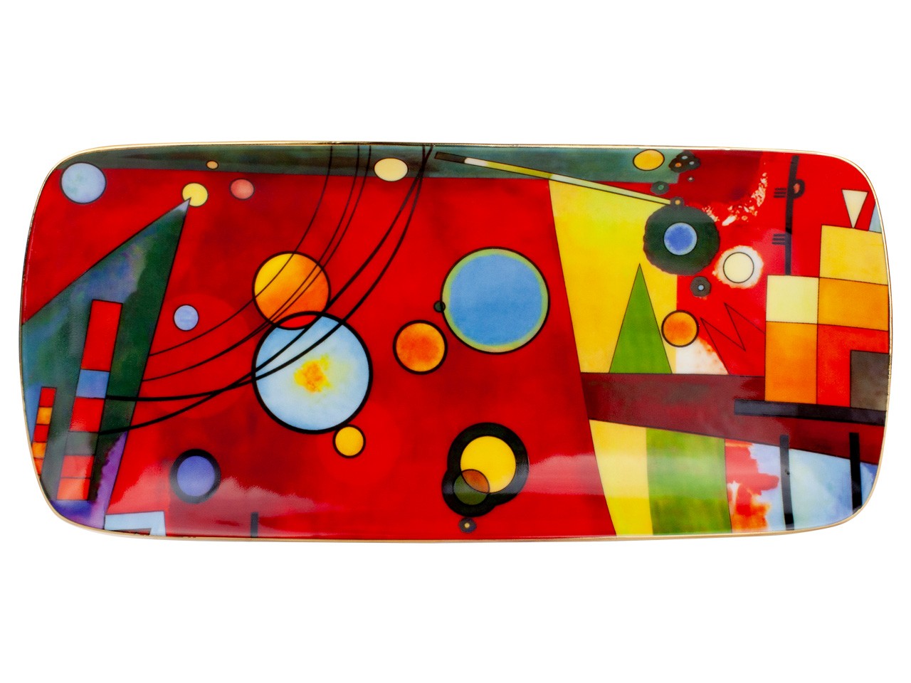 Talerz dekoracyjny inspirowany abstrakcyjnymi dziełami wielkiego malarza Kandinsky'ego. Zapakowany w ozdobne opakowanie prezentowe. Szerokość 30 cm