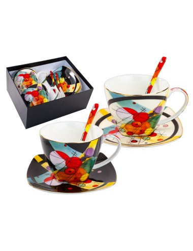 Zestaw 2 eleganckich filiżanek ze spodkiem i łyżeczkami, inspirowane abstrakcyjnymi dziełami wielkiego malarza Kandinsky'ego. Zapakowana w ozdobne opakowanie prezentowe. Pojemność 2*250 ml