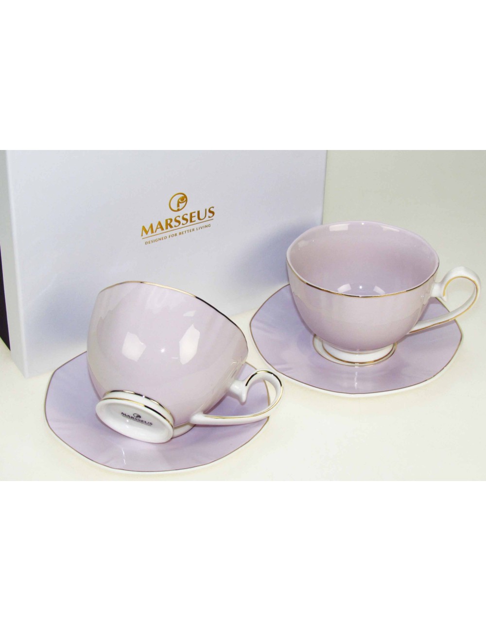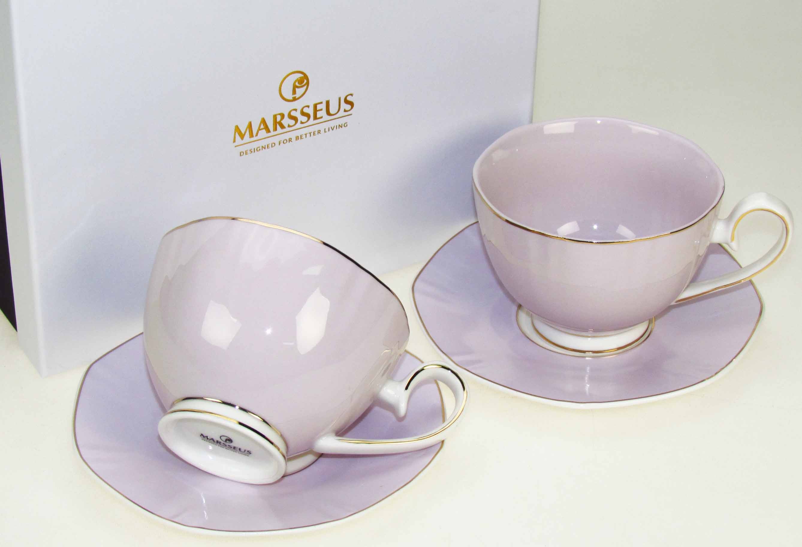 Zestaw 2 pastelowych filiżanek ze spodkami z wyjątkowej kolekcji Glamour by Marsseus. Zapakowane w ozdobne opakowanie prezentowe. Pojemność 2*240 ml