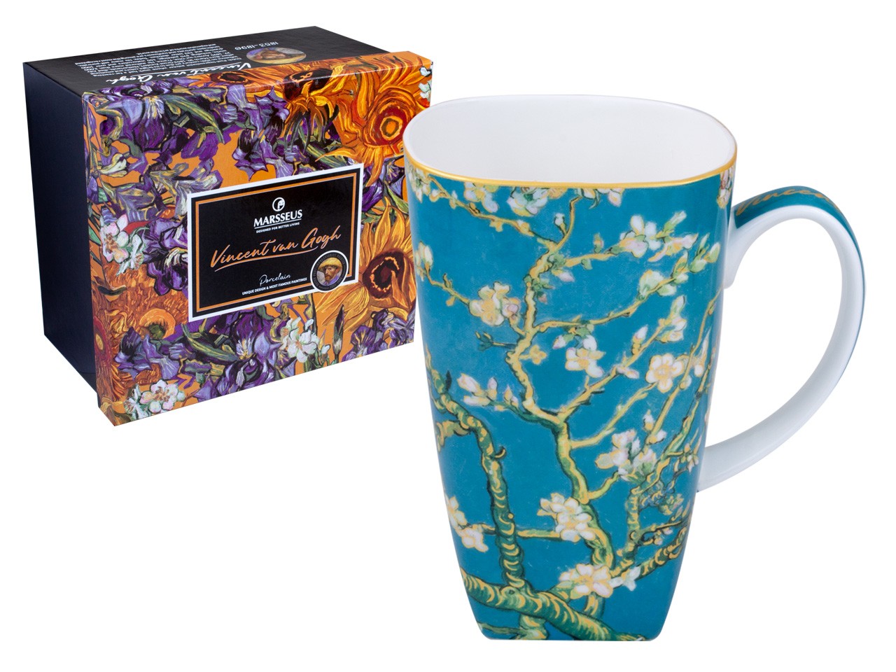Elegancki kubek inspirowany pracą Vincenta van Gogha "Kwitnący migdałowiec". Zapakowany w ozdobne opakowanie prezentowe. Pojemność 600 ml