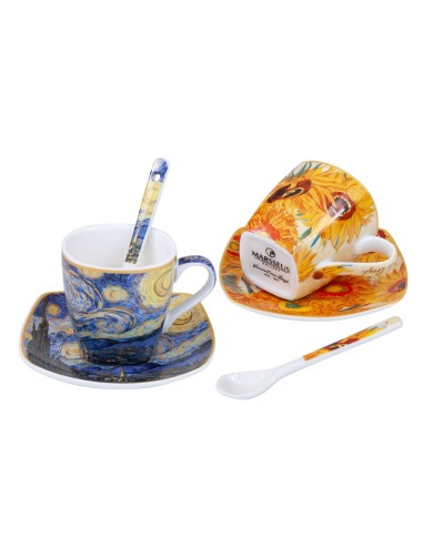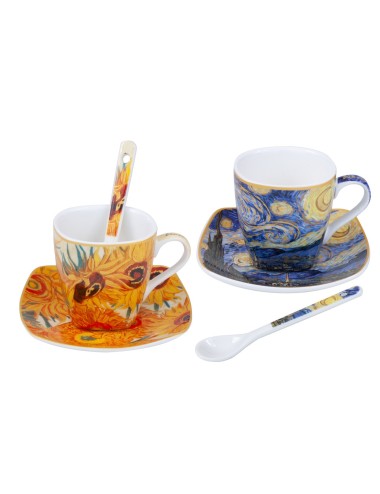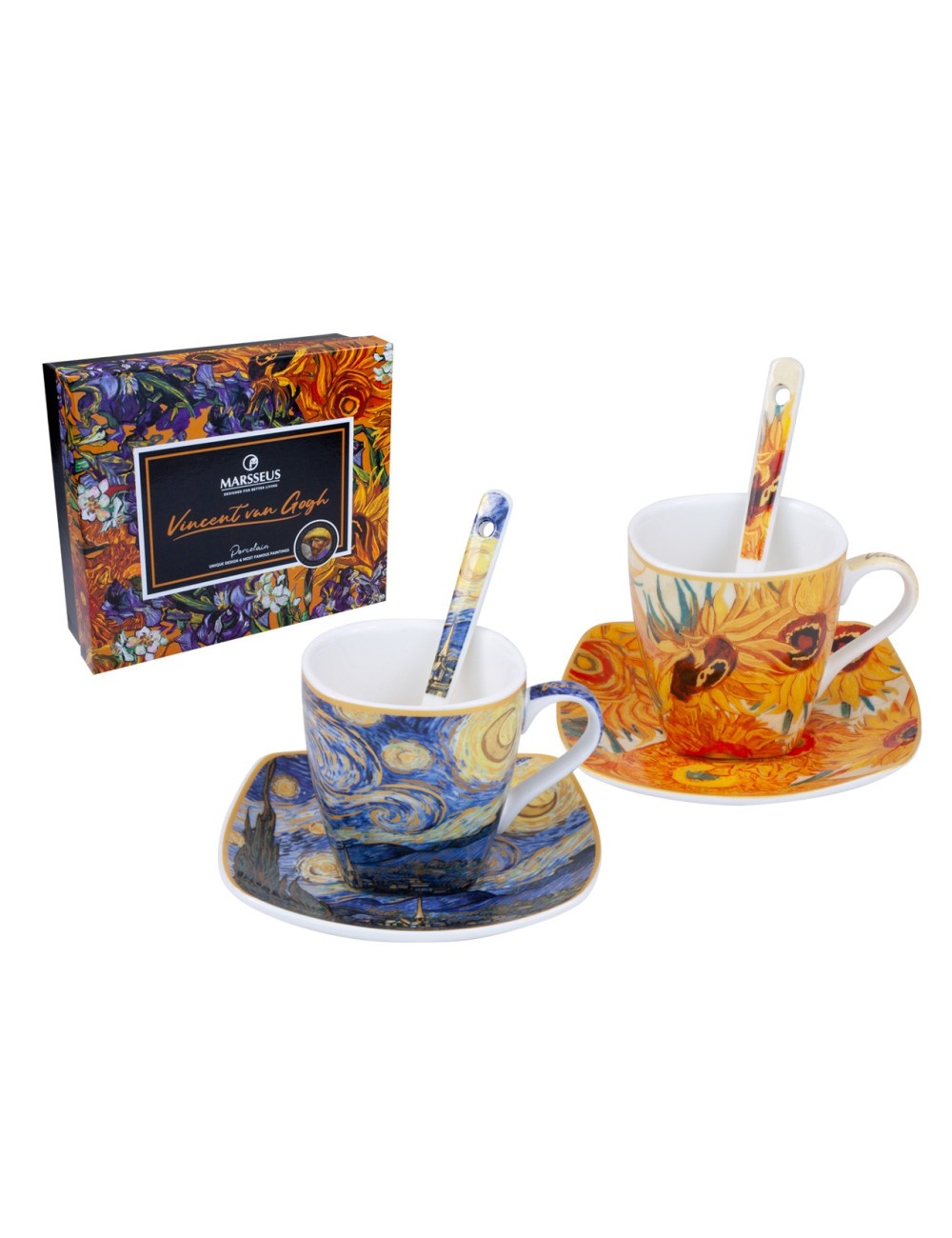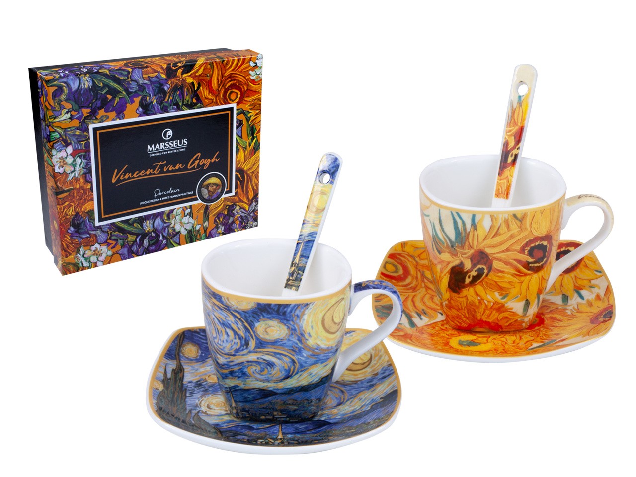Zestaw dwóch eleganckich filiżanek do espresso z łyżeczkami, inspirowanych pracami Vincenta van Gogha "Słoneczniki" oraz "Gwiaździsta noc" . Zapakowane w ozdobne opakowanie prezentowe.Pojemność 100ml*2
