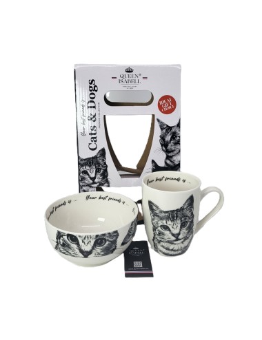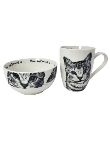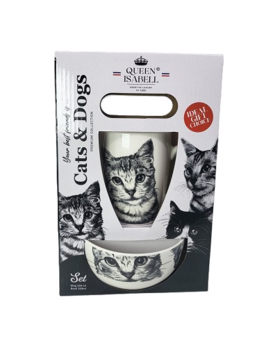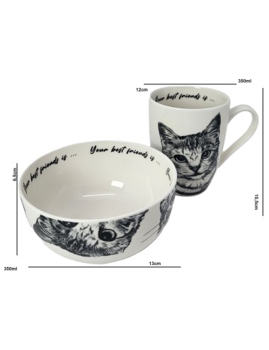 Kubek i miseczka wykonane z porcelany z wizerunkiem kota amerykańskiego. Zapakowany w opakowanie prezentowe. Pojemność: 350 ml *2
