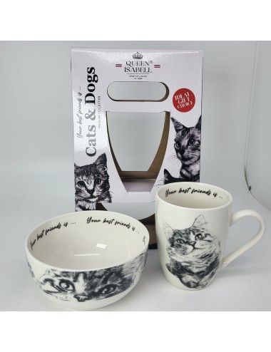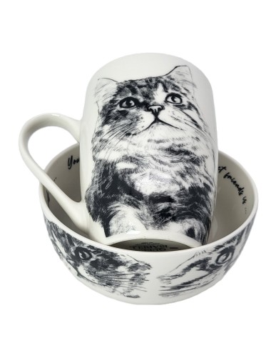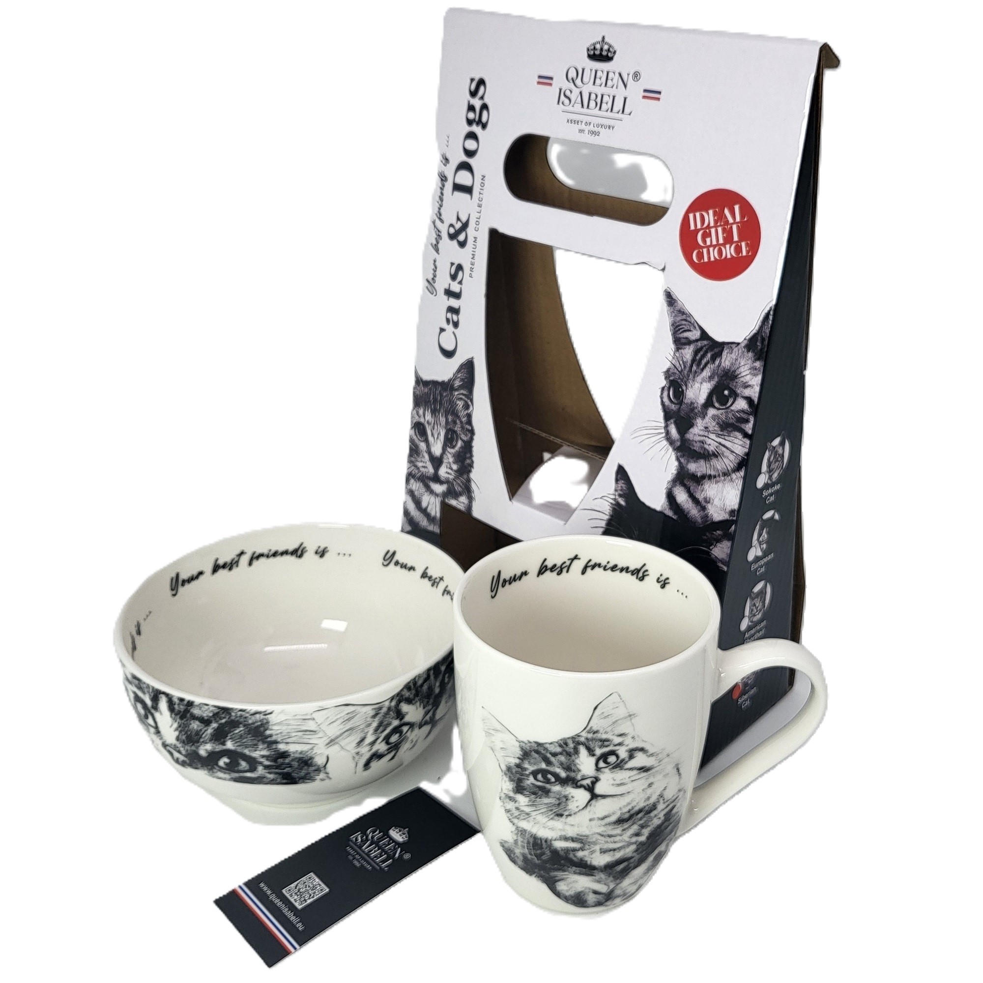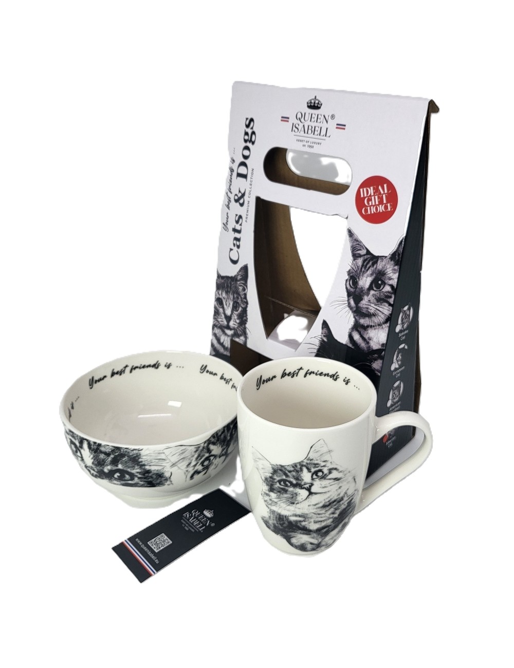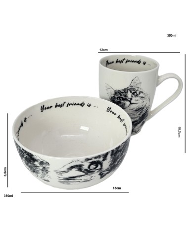 Kubek i miseczka wykonane z porcelany z wizerunkiem kota sokoke. Zapakowany w opakowanie prezentowe. Pojemność: 350 ml *2