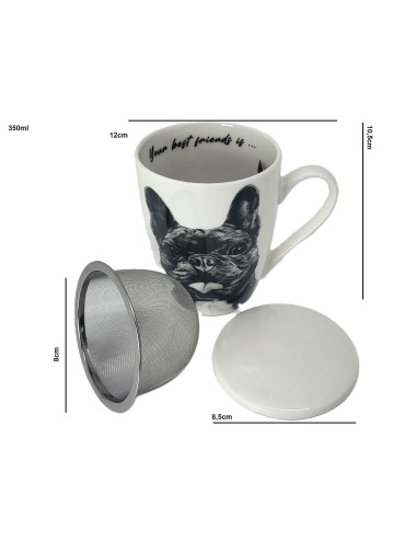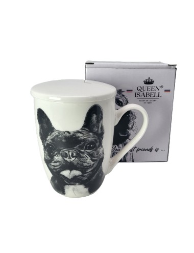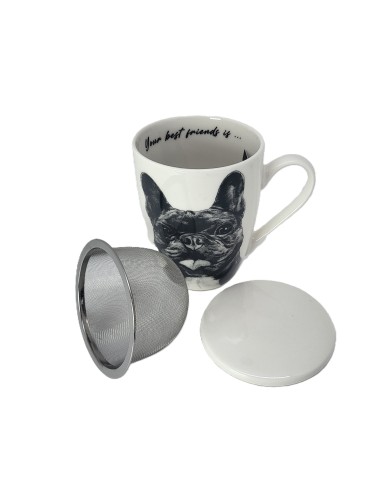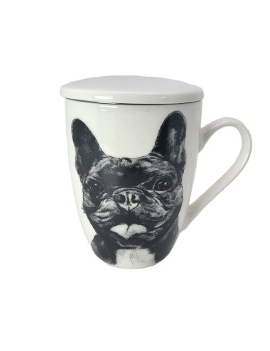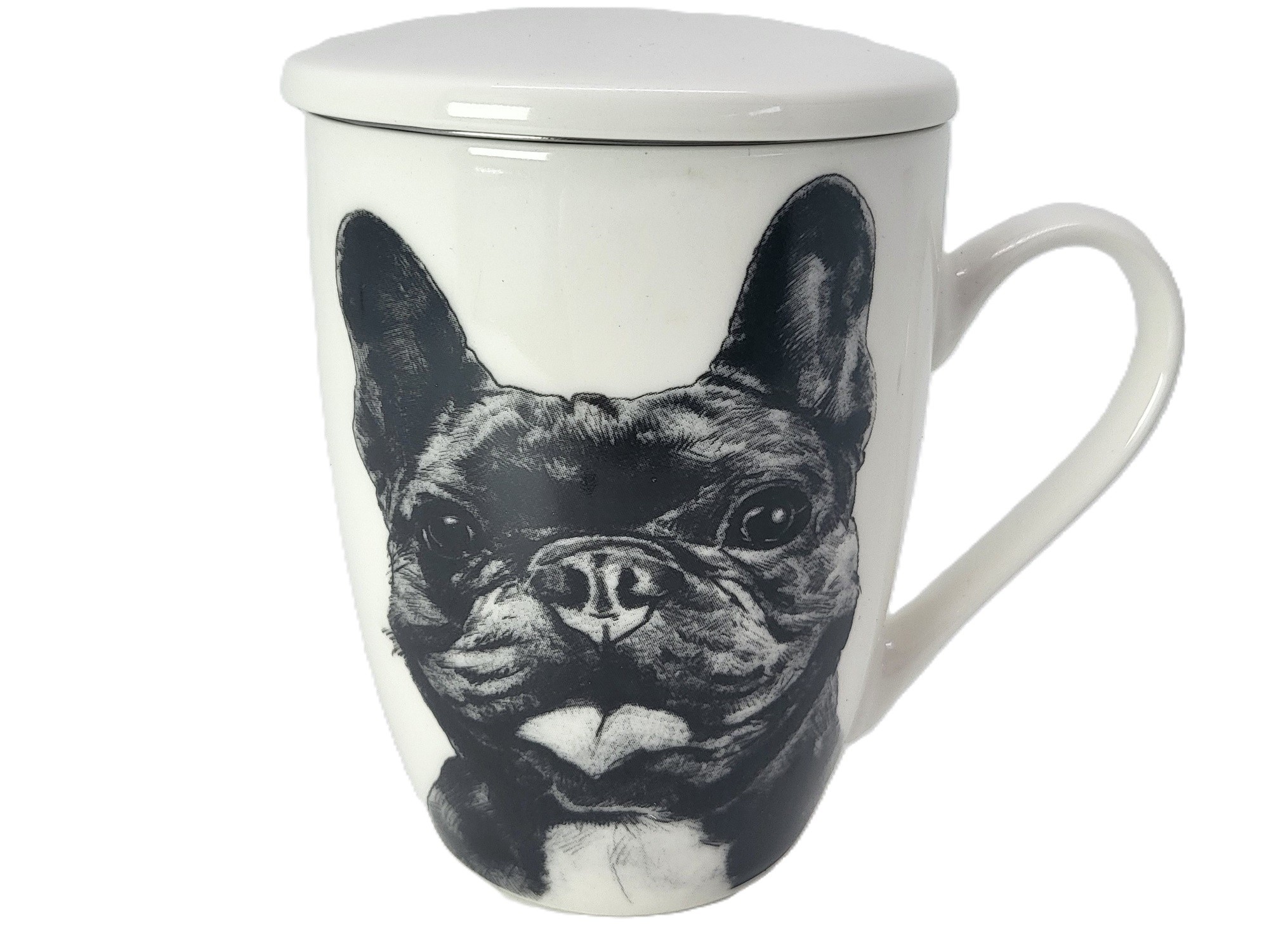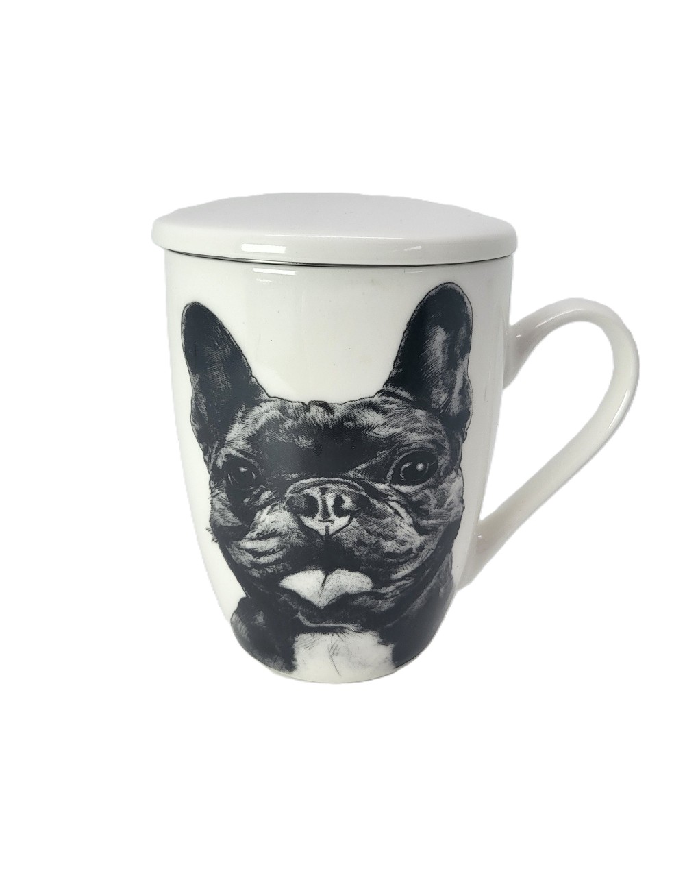 Kubek z zaparzaczem i przykrywką, wykonany z porcelany z wizerunkiem psa rasy buldog francuski. Zapakowany w opakowanie prezentowe. Pojemność: 350 ml