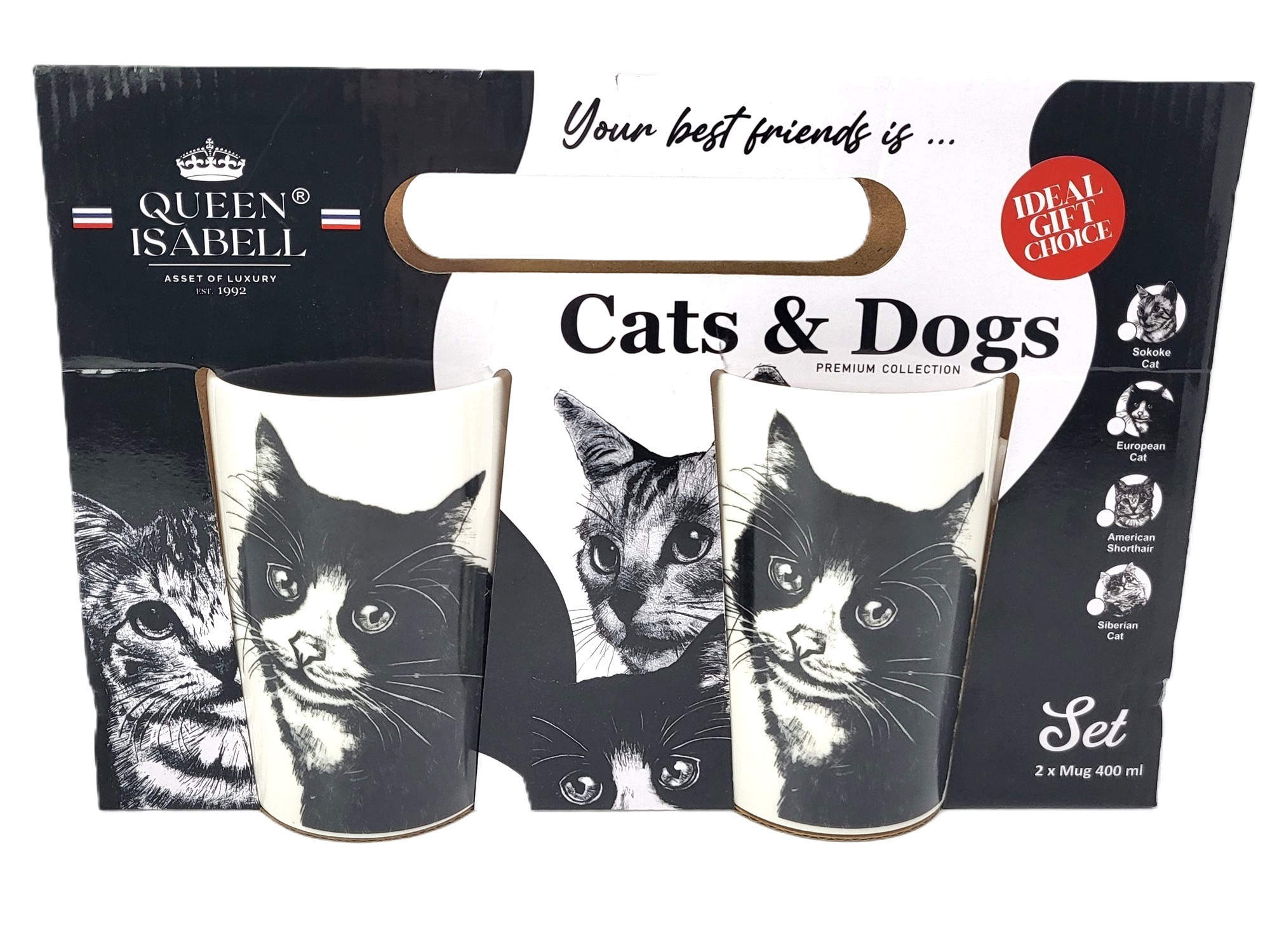 Zestaw dużych kubków wykonanych z porcelany z wizerunkiem kota europejskiego. Zapakowany w opakowanie prezentowe. Pojemność: 400 ml*2