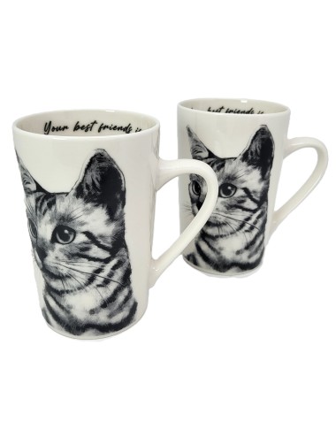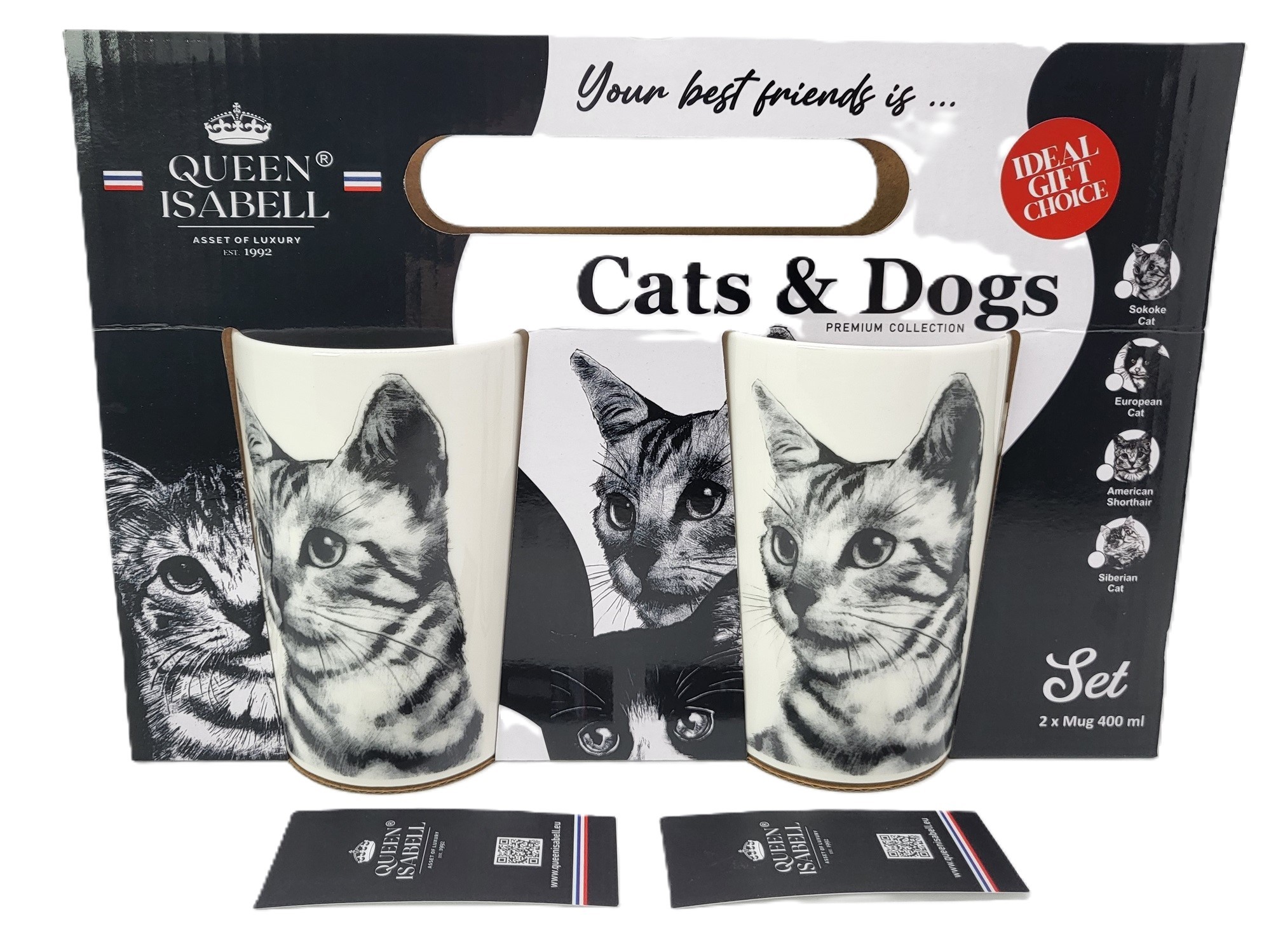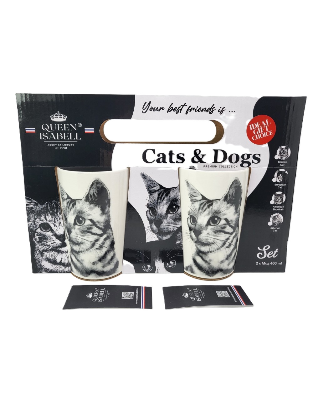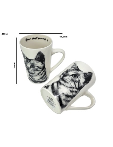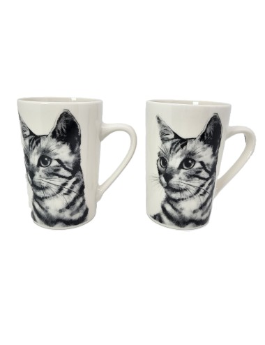 Zestaw dużych kubków wykonanych z porcelany z wizerunkiem kota sokoke. Zapakowany w opakowanie prezentowe. Pojemność: 400 ml*2