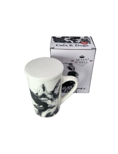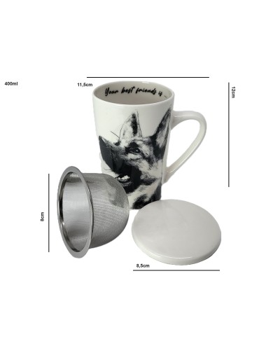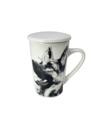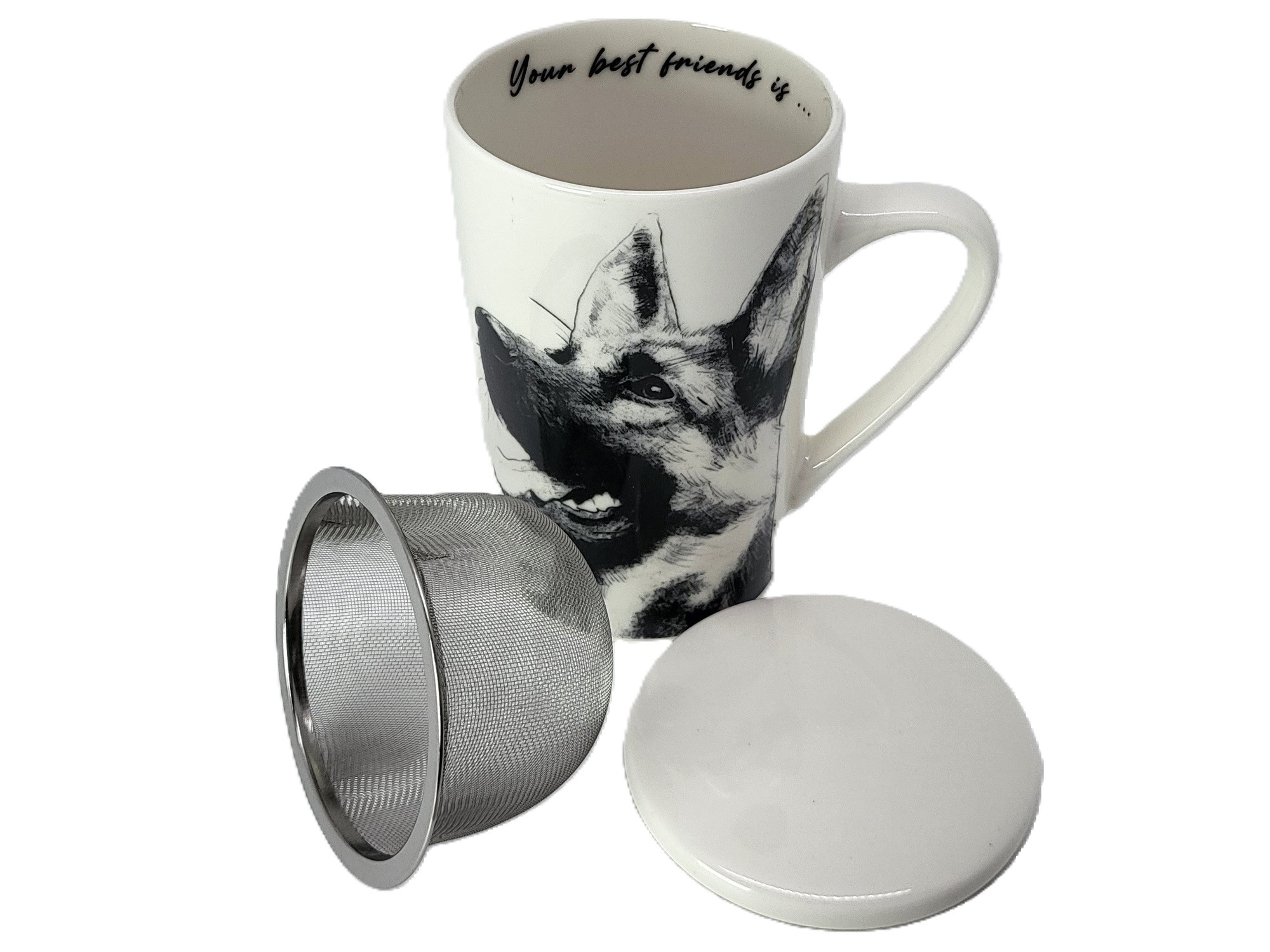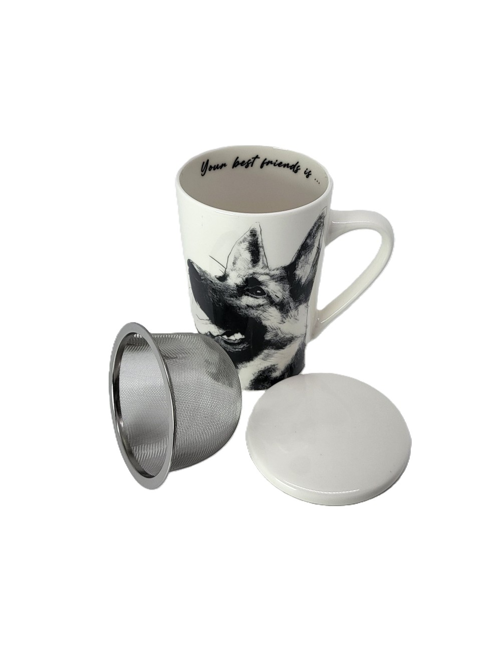 Duży kubek z zaparzaczem i przykrywką, wykonany z porcelany z wizerunkiem psa rasy owczarek niemiecki. Zapakowany w opakowanie prezentowe. Pojemność: 350 ml