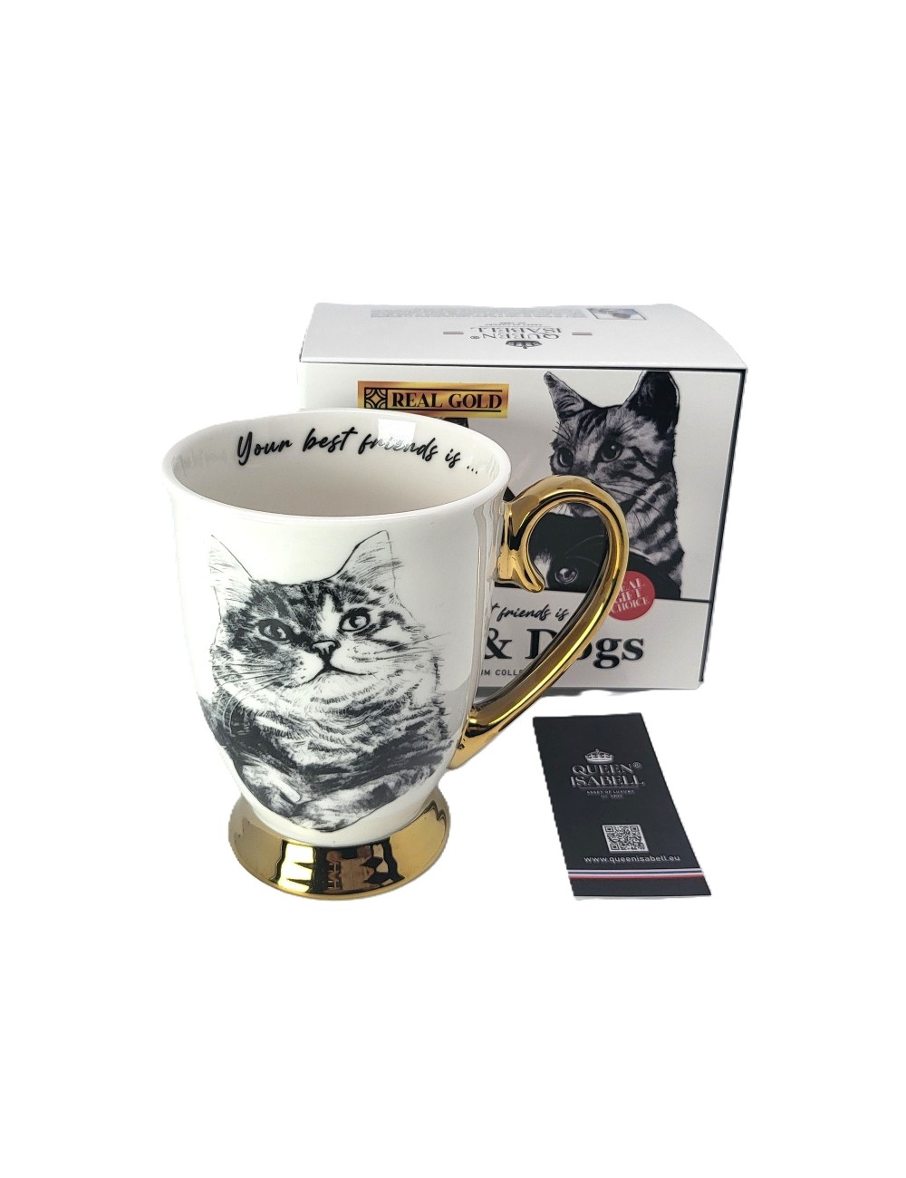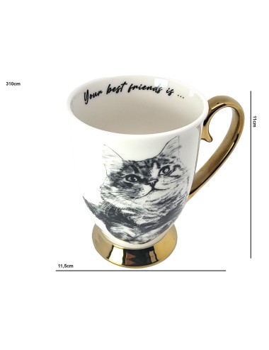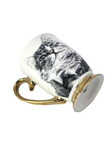 Złocony kubek wykonany z porcelany z wizerunkiem kota syberyjskiego. Zapakowany w opakowanie prezentowe. Pojemność: 310 ml