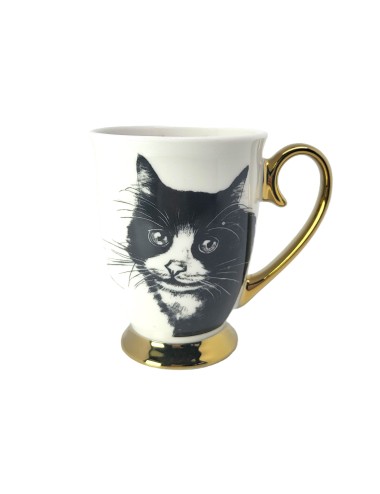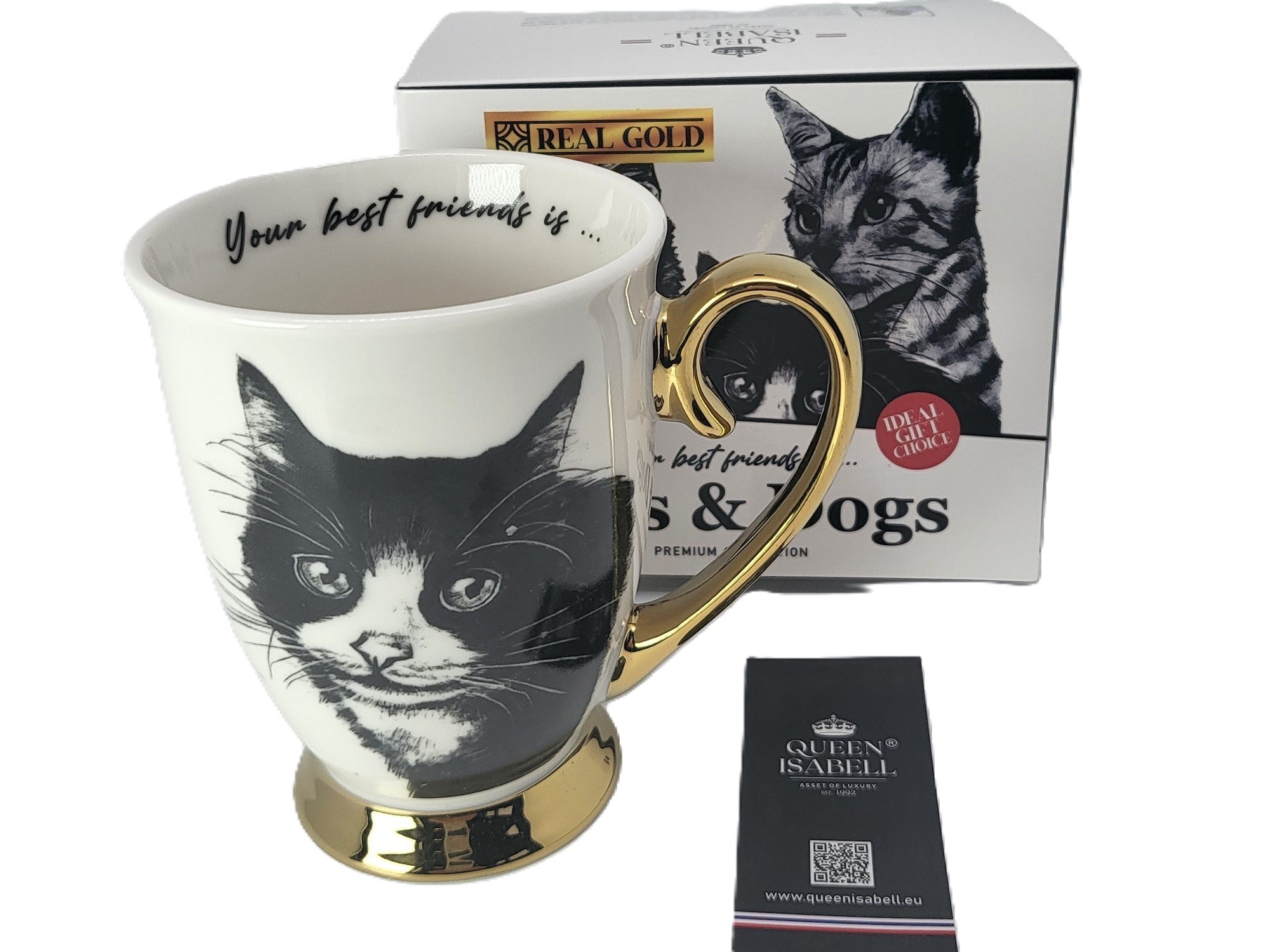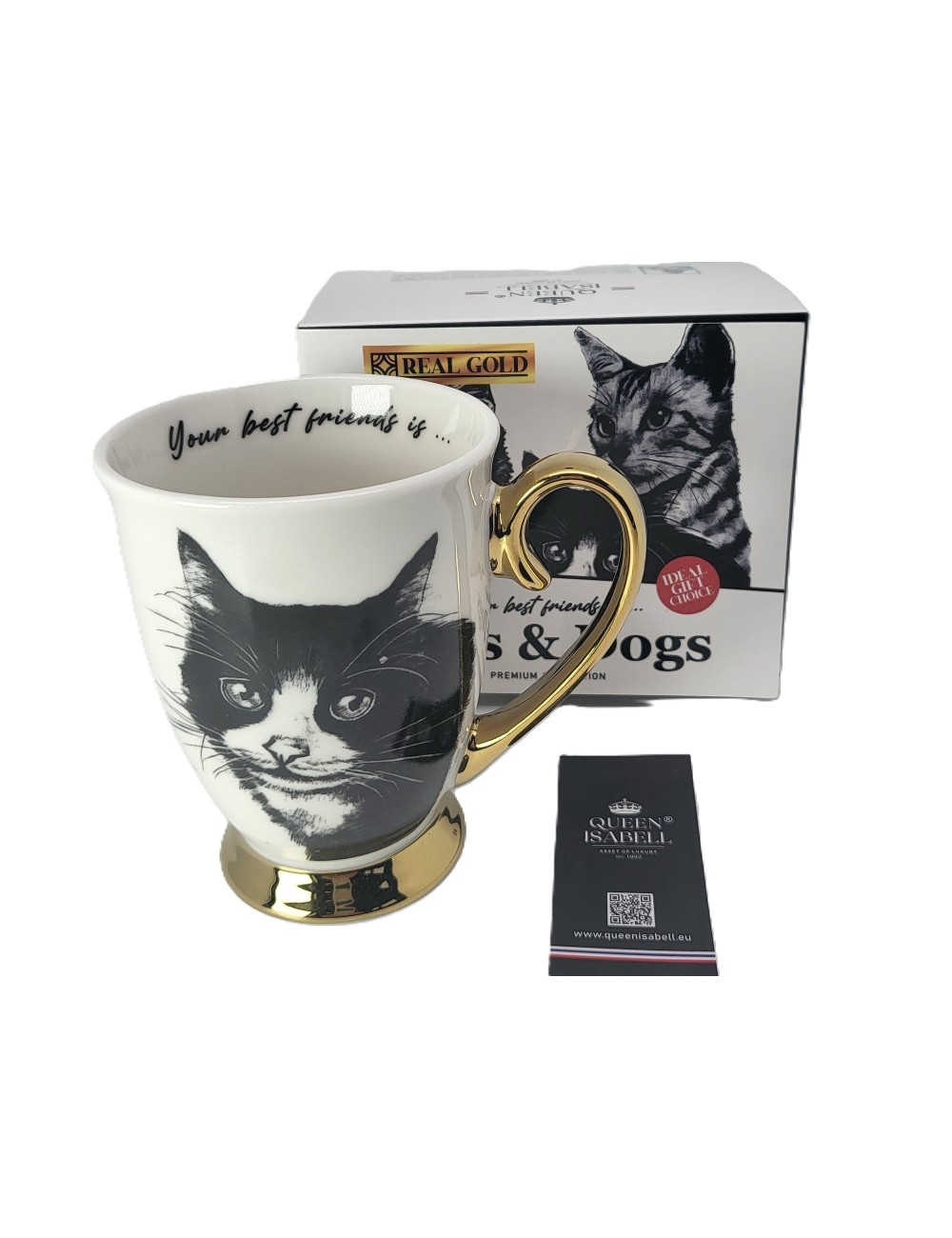 Złocony kubek wykonany z porcelany z wizerunkiem kota europejskiego. Zapakowany w opakowanie prezentowe. Pojemność: 310 ml