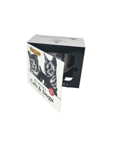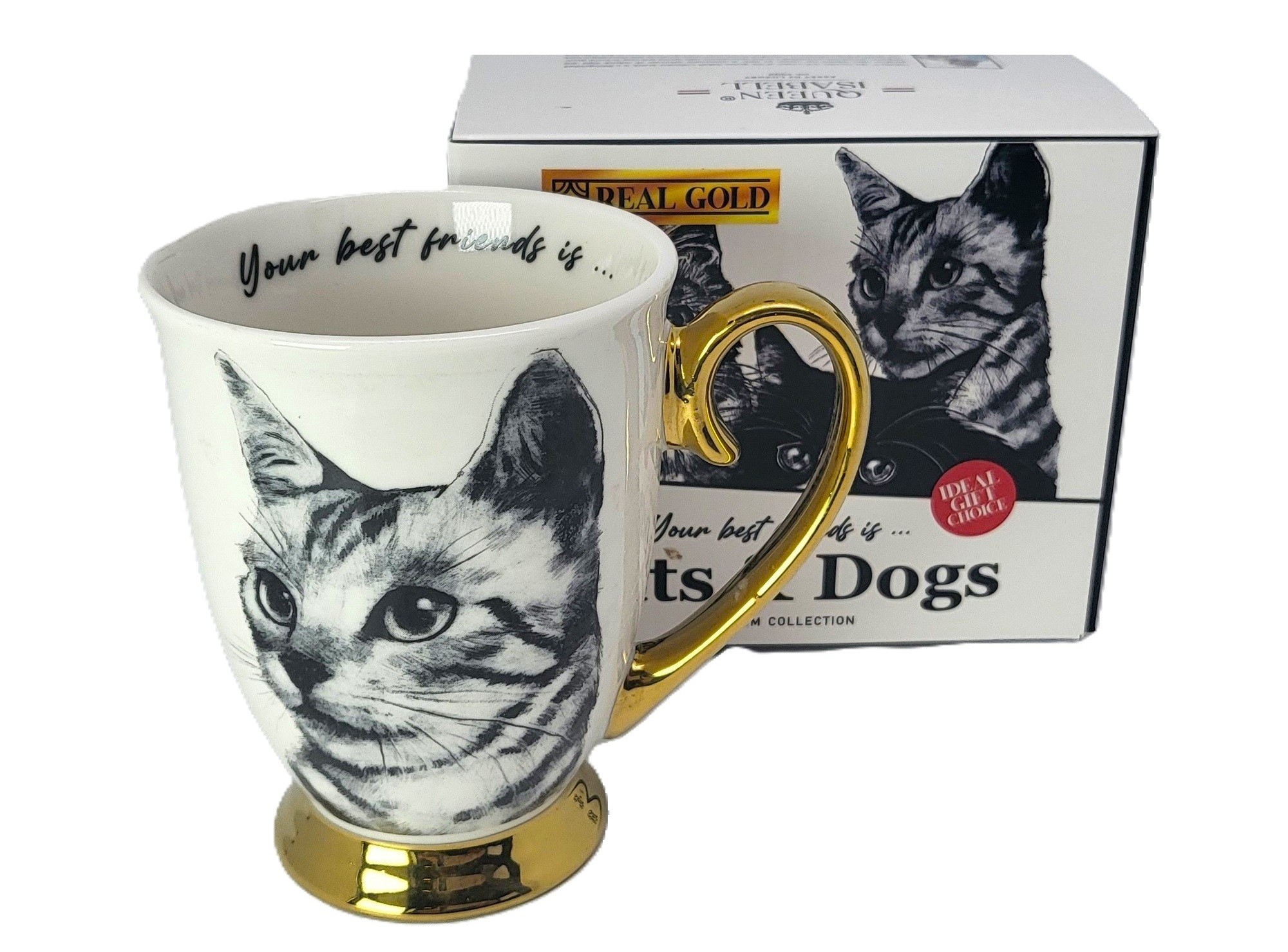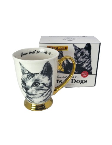 Złocony kubek wykonany z porcelany z wizerunkiem kota sokoke. Zapakowany w opakowanie prezentowe. Pojemność: 310 ml