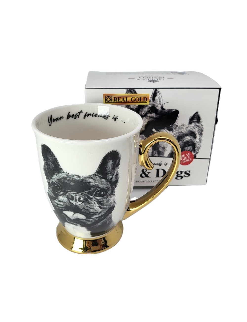 Złocony kubek wykonany z porcelany z wizerunkiem psa rasy buldog francuski. Zapakowany w opakowanie prezentowe. Pojemność: 310 ml