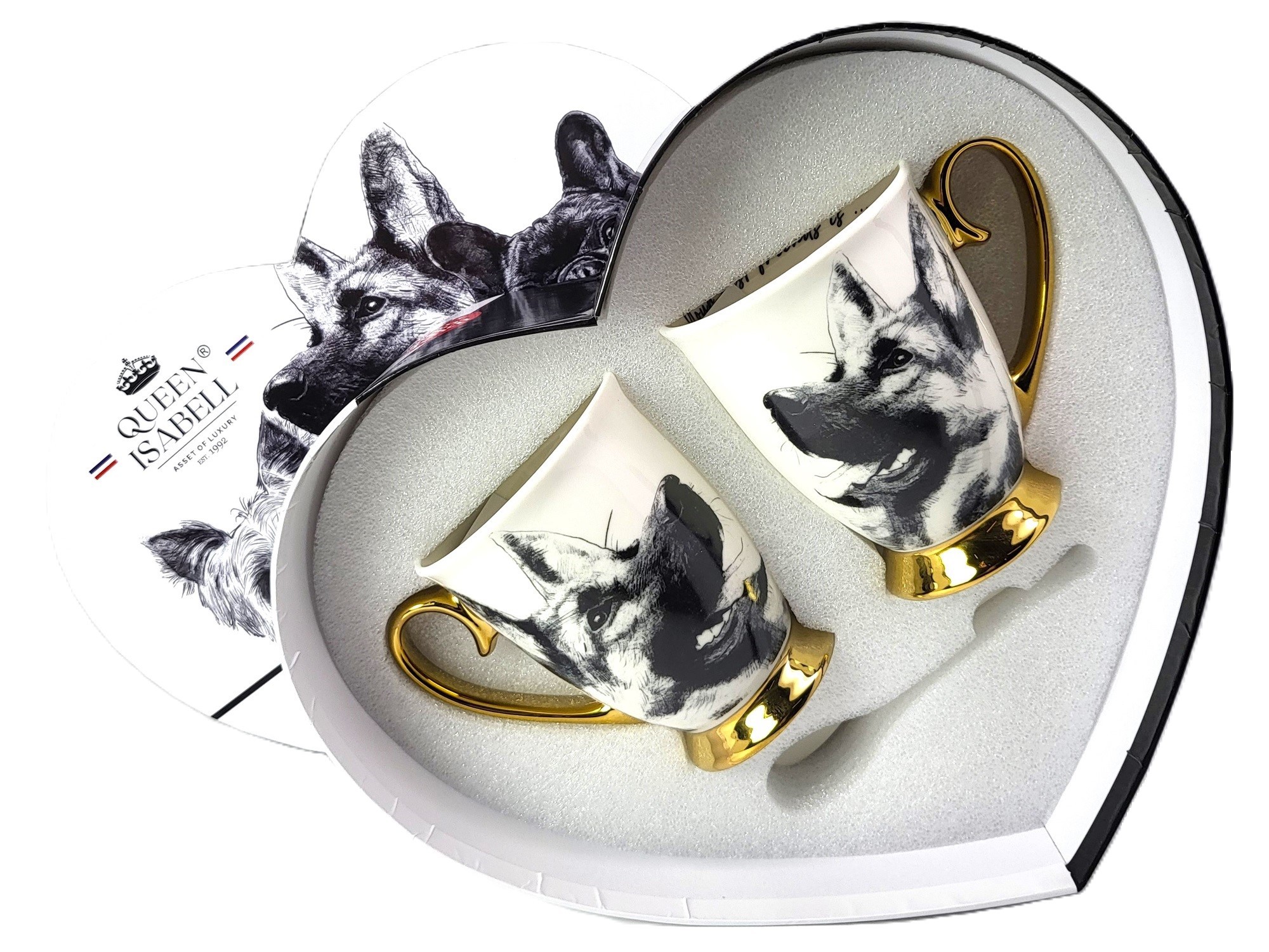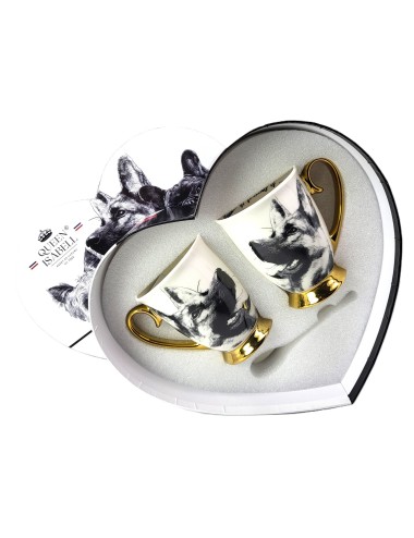 Zestaw złoconych kubków wykonanych z porcelany z wizerunkiem psa rasy owczarek niemiecki. Zapakowany w opakowanie prezentowe. Pojemność: 310 ml*2