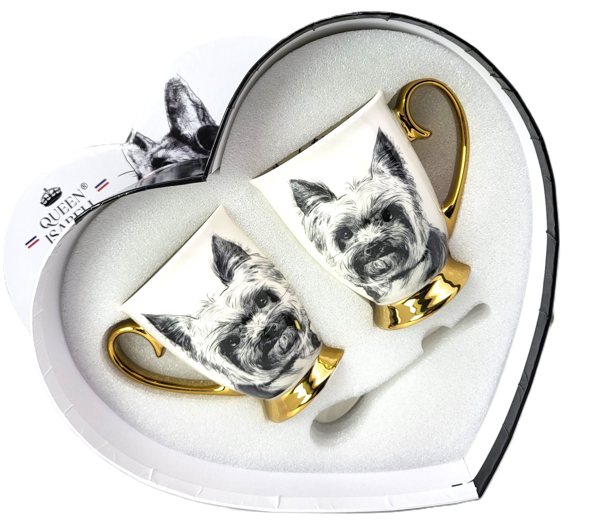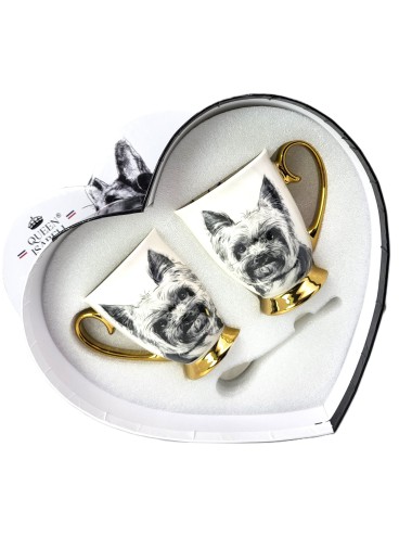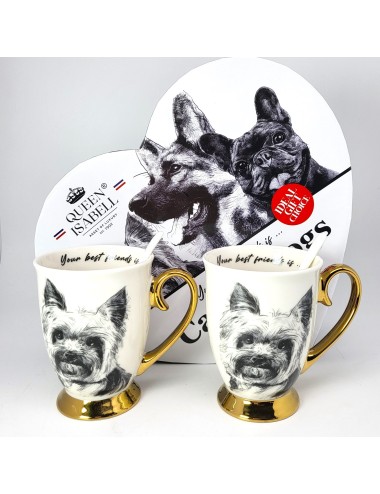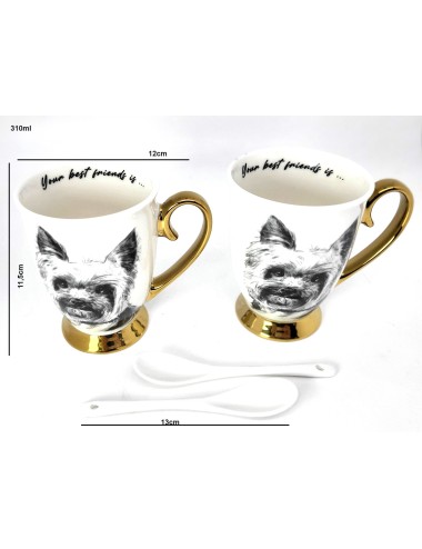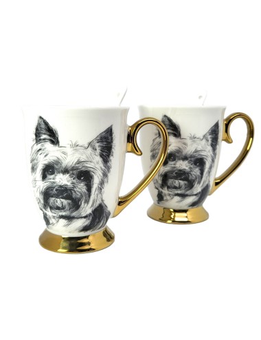 Zestaw złoconych kubków wykonanych z porcelany z wizerunkiem psa rasy york. Zapakowany w opakowanie prezentowe. Pojemność: 310 ml*2