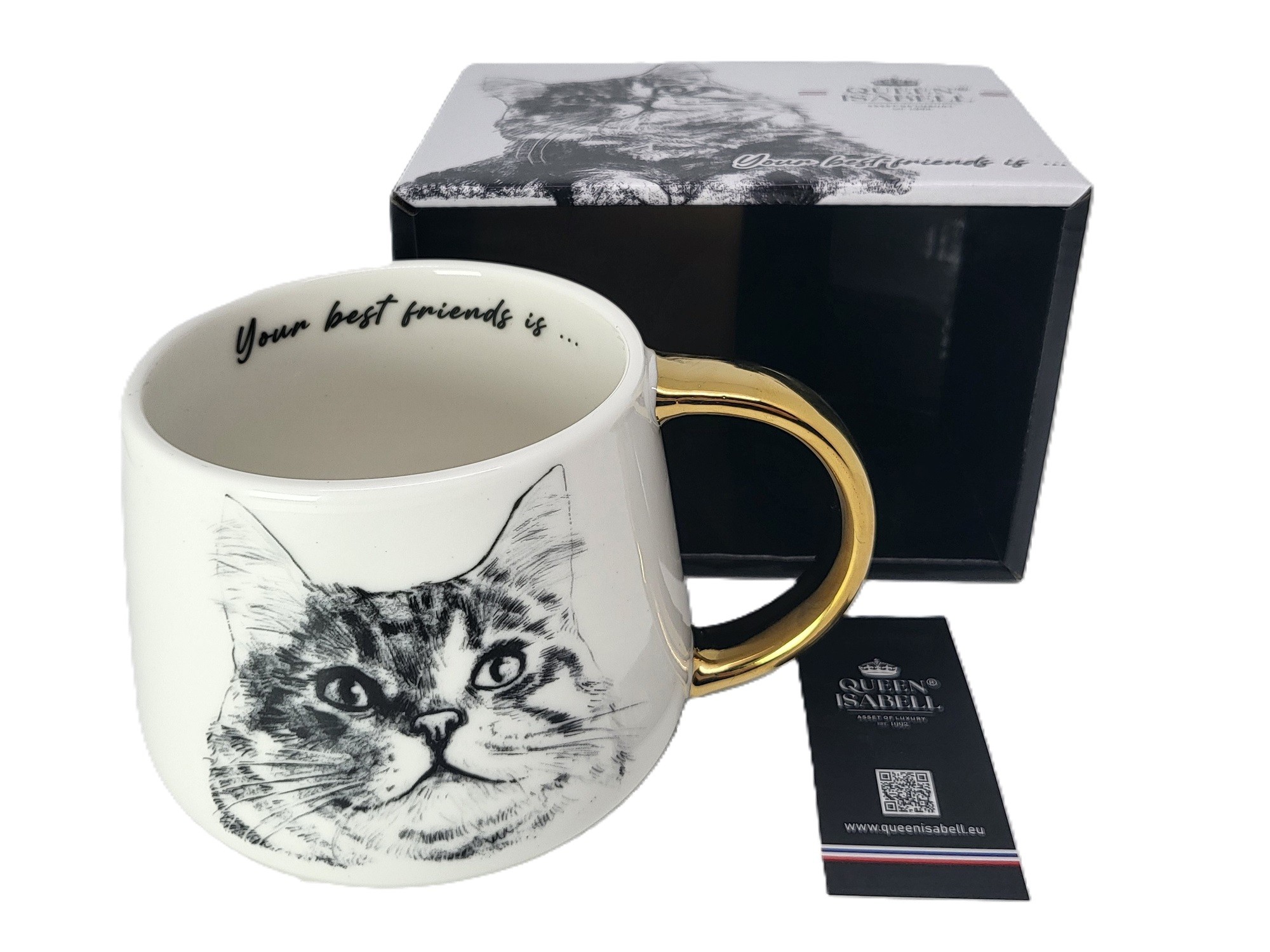 Duży złocony kubek wykonany z porcelany z wizerunkiem kota syberyjskiego. Zapakowany w opakowanie prezentowe. Pojemność: 400 ml