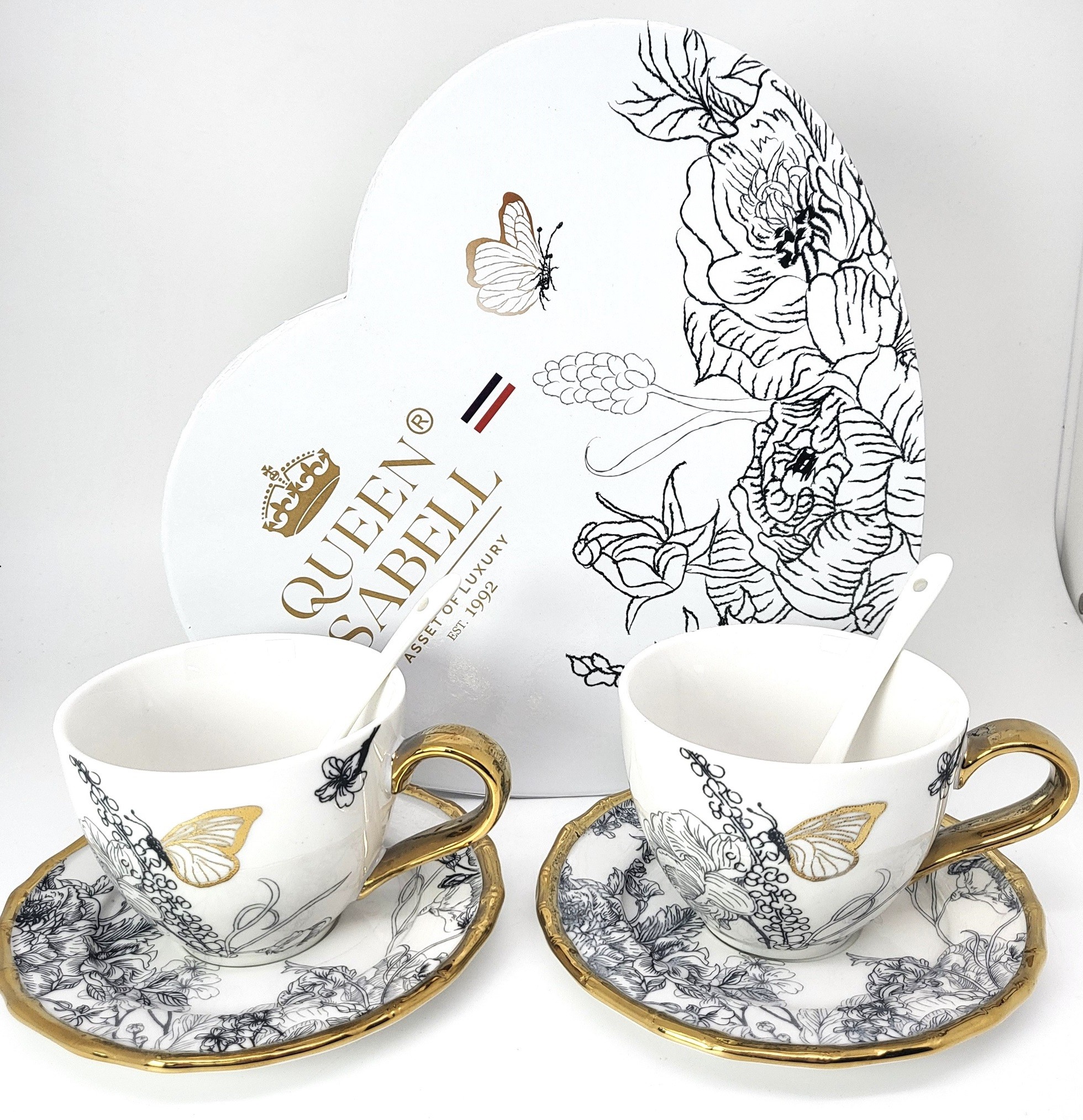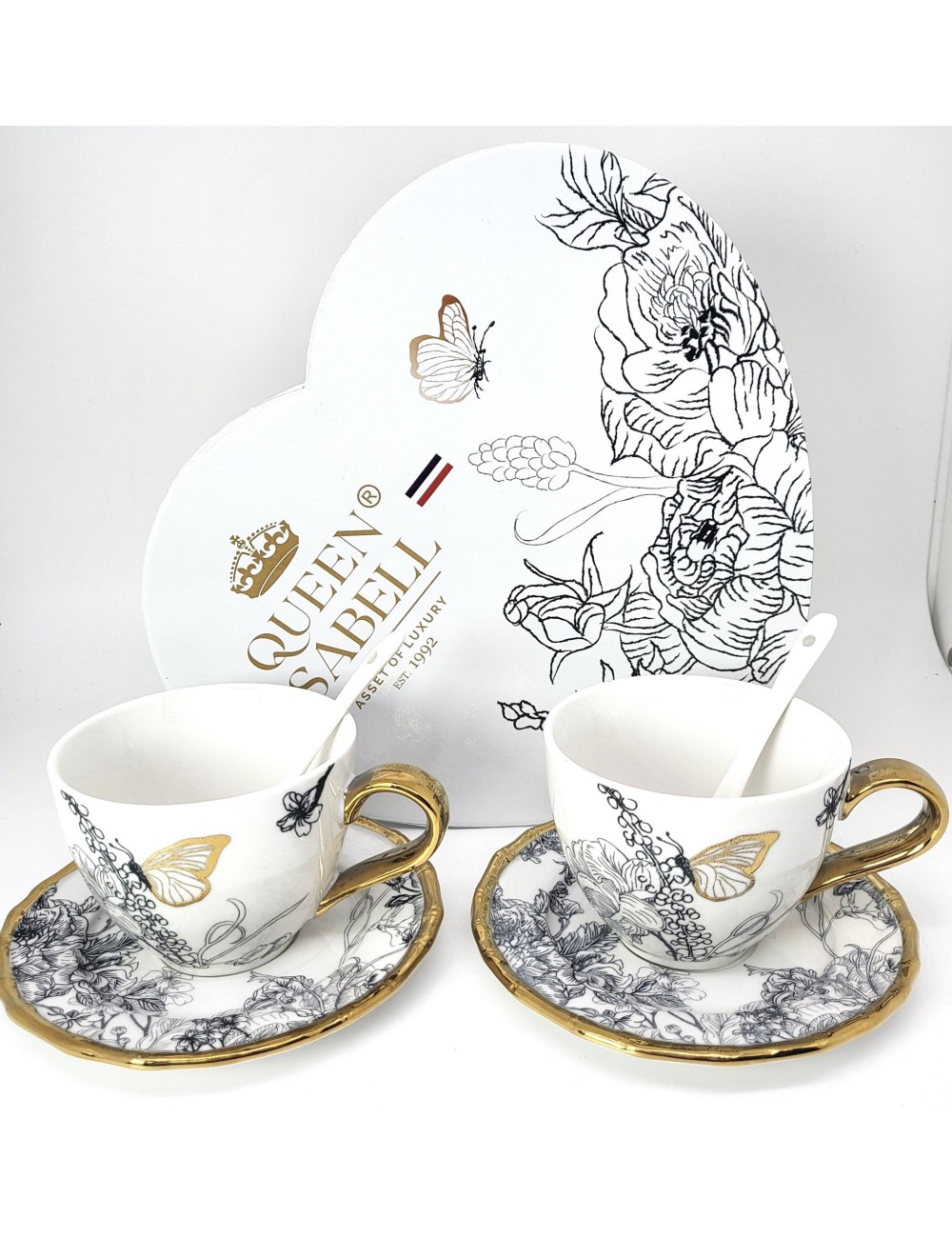 Zestaw eleganckich filiżanek ze spodkami wykonany z najwyższej jakości porcelany Bone China, zdobiony motywem kwiatów i motyli. Zapakowany w opakowanie prezentowe. Pojemność: 200 ml*2