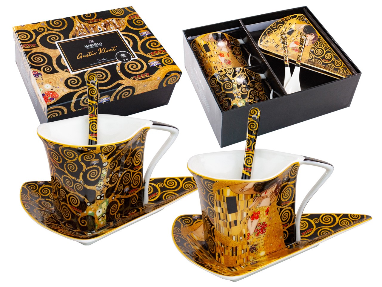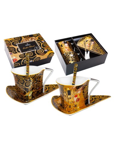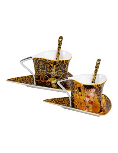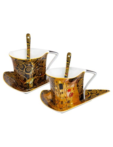 Zestaw dwóch eleganckich filiżanek o fantazyjnym kształcie z łyżeczkami, inspirowane pracami Gustava Klimta "Pocałunek" oraz "Drzewo życia". Zapakowane w ozdobne opakowanie prezentowe. Pojemność 2*250 ml