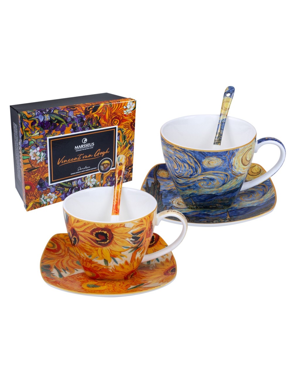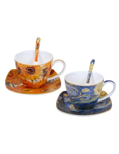 Zestaw dwóch eleganckich filiżanek z łyżeczkami, inspirowanych pracami Vincenta van Gogha "Słoneczniki" oraz "Gwiaździsta noc". Zapakowane w ozdobne opakowanie prezentowe. Pojemność 250 ml*2