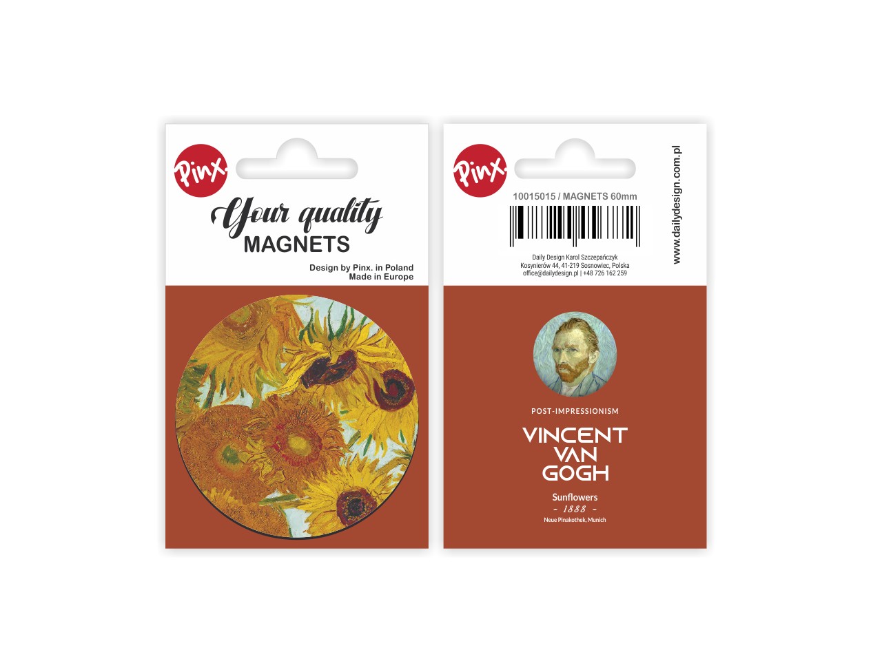 Okrągły magnes inspirowany dziełem wielkiego malarza Vincenta Van Gogha "Słoneczniki". Magnes został wykonany z wysokiej jakości materiałów, pokryty folią zabezpieczającą. Zapakowany w estetyczną folię z kartonikiem. Średnica 6 cm