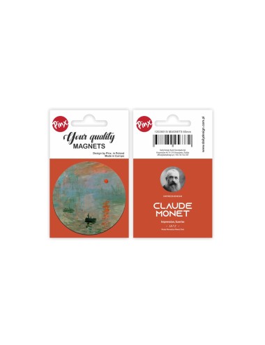 Okrągły magnes inspirowany dziełem wielkiego malarza Claude’a Moneta "Impresja, Wschód Słońca". Magnes został wykonany z wysokiej jakości materiałów, pokryty folią zabezpieczającą. Zapakowany w estetyczną folię z kartonikiem. Średnica 6 cm