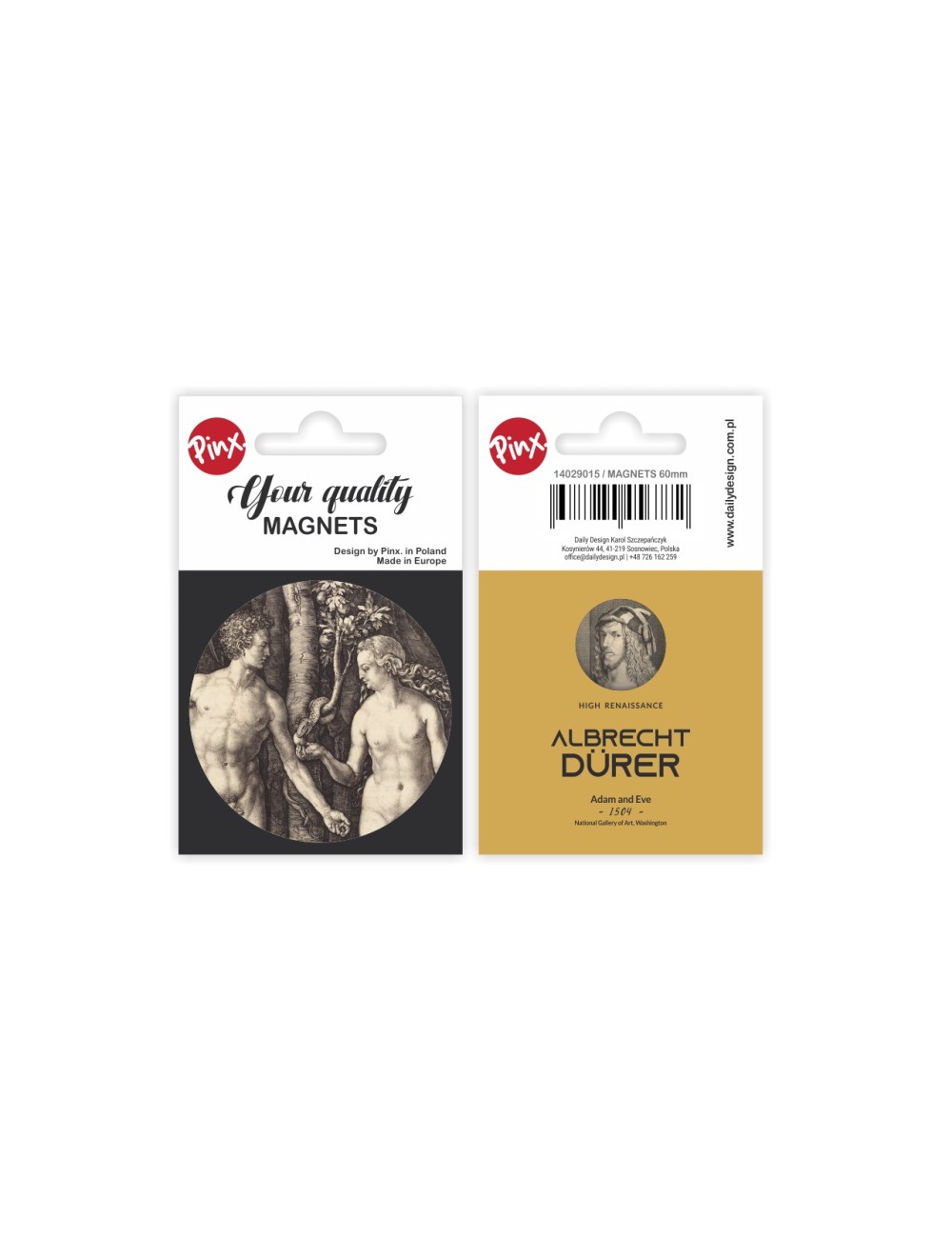 Okrągły magnes inspirowany dziełem wielkiego malarza Albrechta Dürera "Adam i Ewa". Magnes został wykonany z wysokiej jakości materiałów, pokryty folią zabezpieczającą. Zapakowany w estetyczną folię z kartonikiem. Średnica 6 cm
