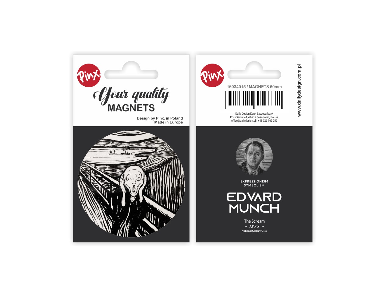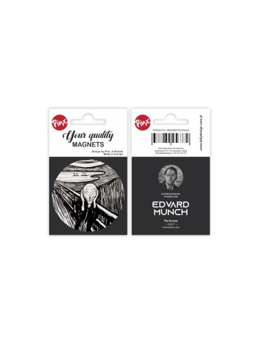 Okrągły magnes inspirowany dziełem wielkiego malarza Edwarda Muncha "Krzyk". Magnes został wykonany z wysokiej jakości materiałów, pokryty folią zabezpieczającą. Zapakowany w estetyczną folię z kartonikiem. Średnica 6 cm