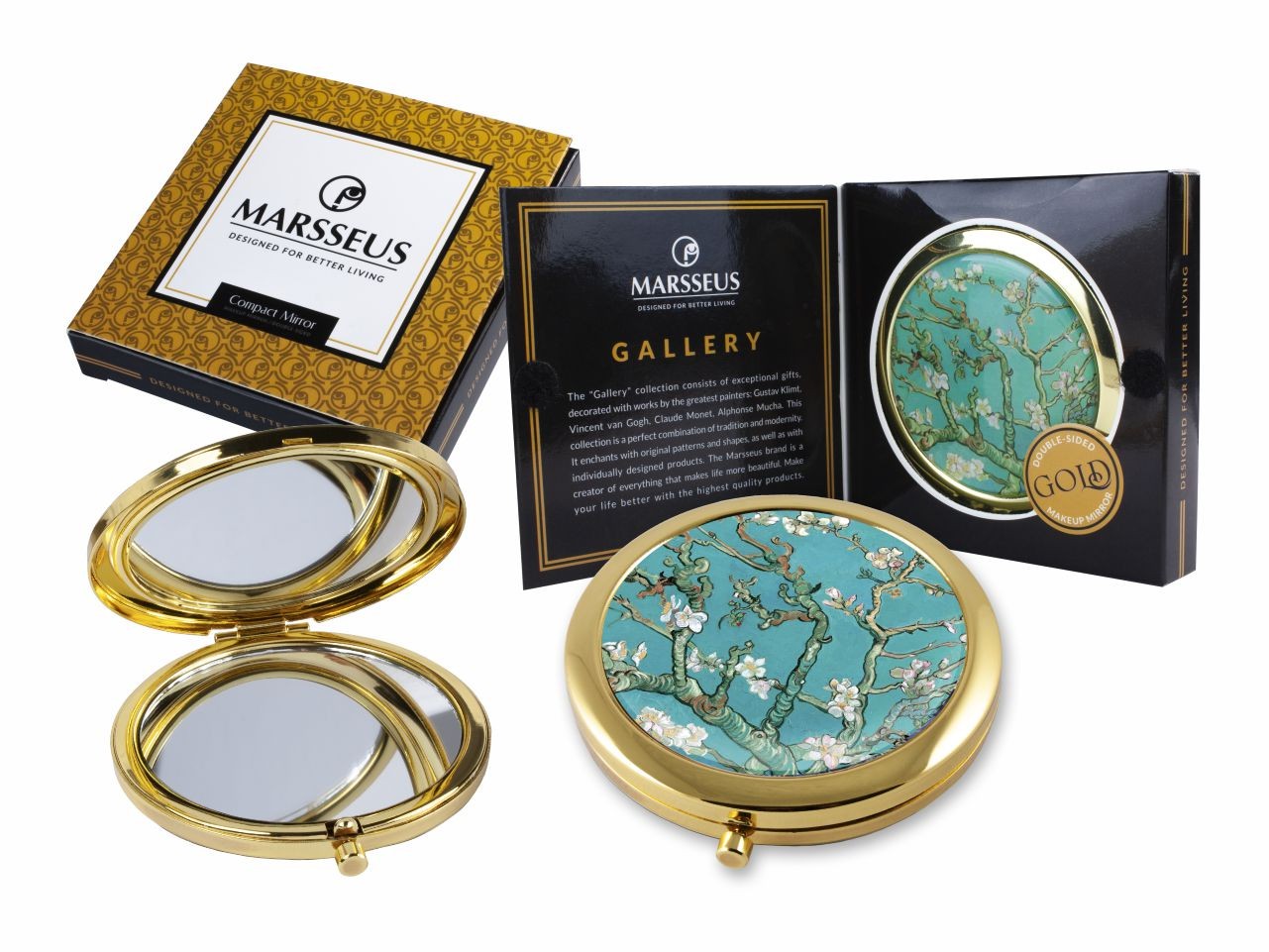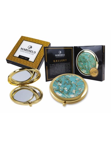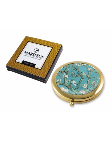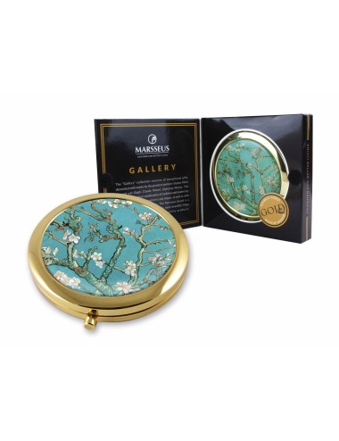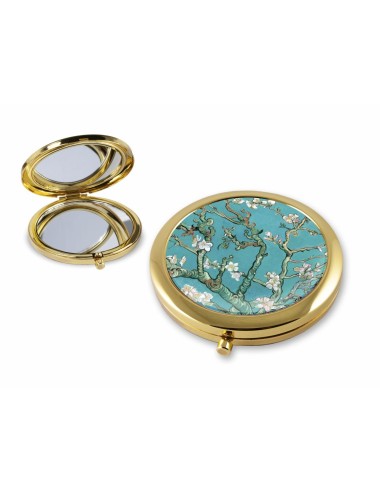 Kieszonkowe składane lusterko inspirowane pracą Vincenta Van Gogha "Kwitnący migdałowiec". Zapakowane w ozdobne pudełko prezentowe. Średnica 7 cm