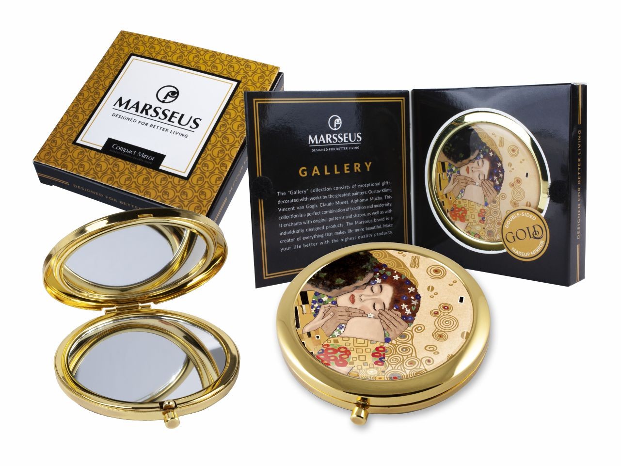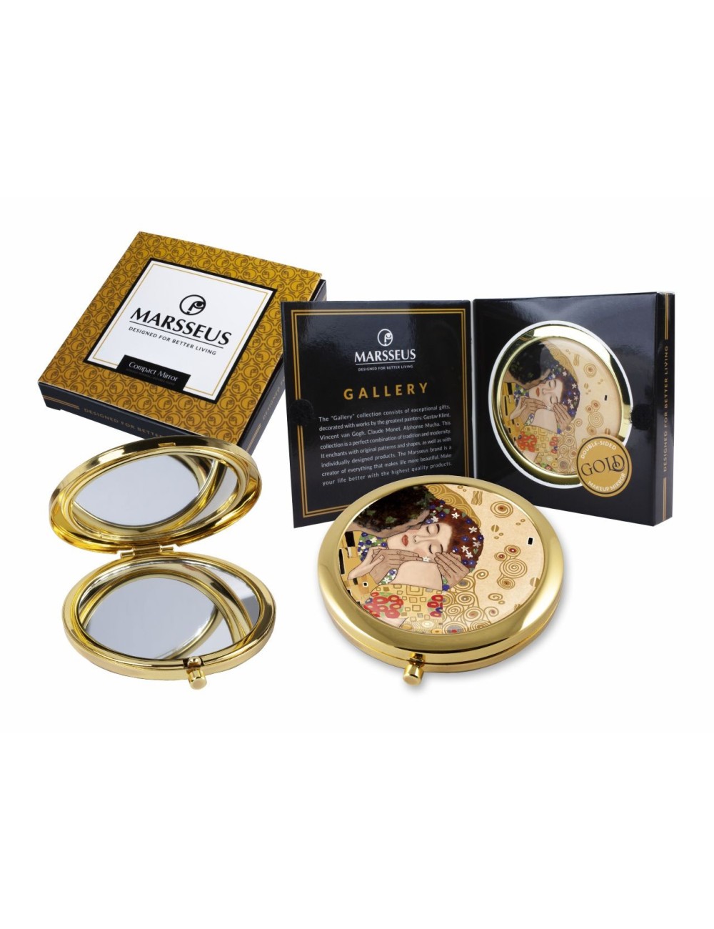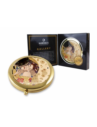 Kieszonkowe składane lusterko inspirowane pracą Gustava Klimta "Pocałunek". Zapakowane w ozdobne pudełko prezentowe. Średnica 7 cm