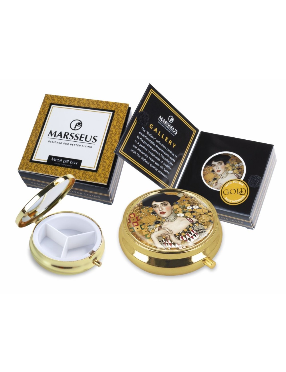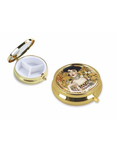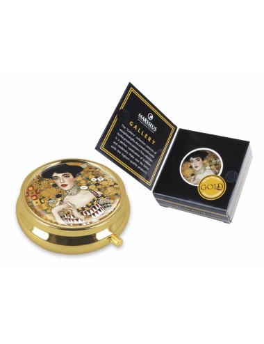 Kieszonkowe puzderko z lusterkiem inspirowane pracą Gustava Klimta "Adele". Zapakowane w ozdobne pudełko prezentowe. Średnica 6 cm