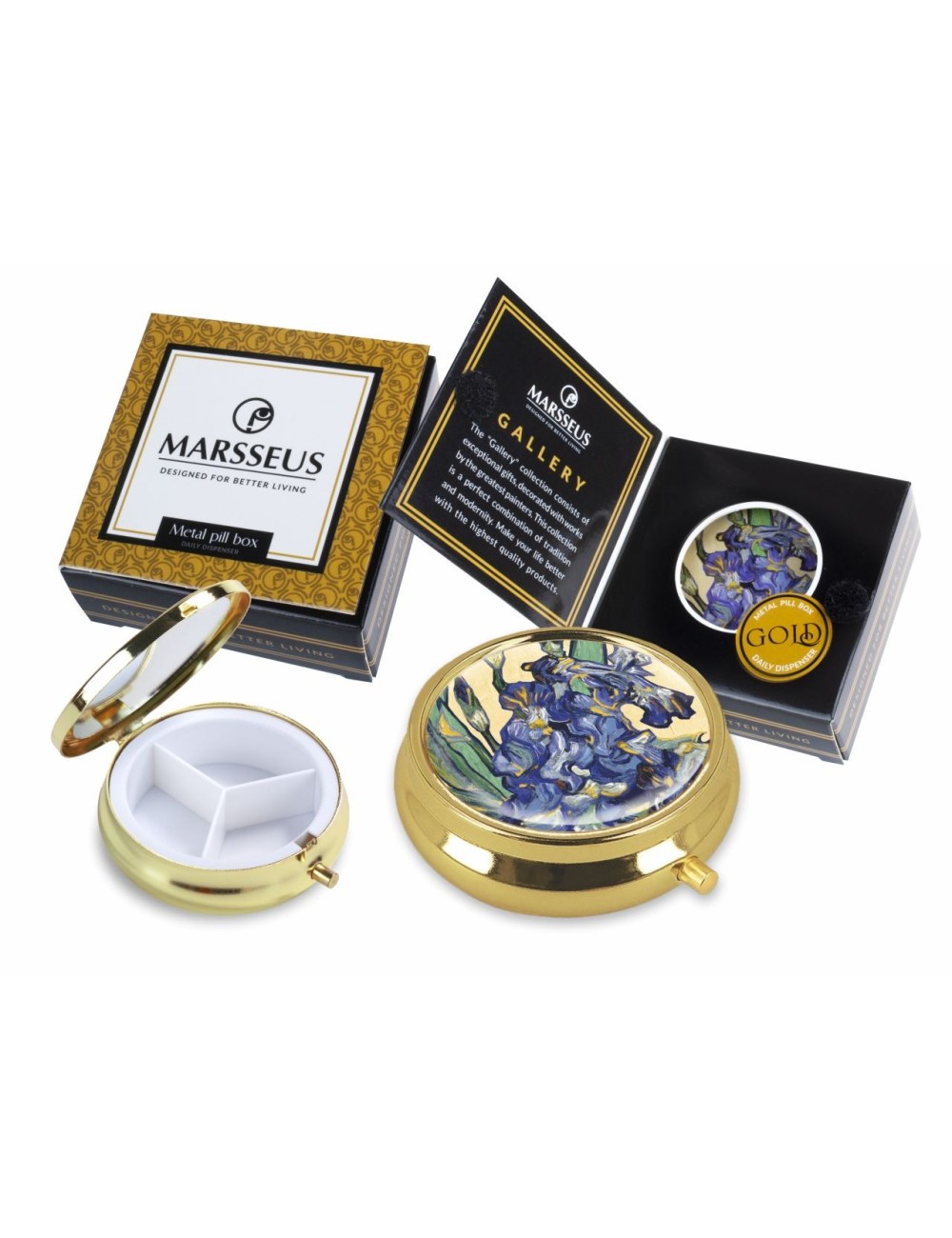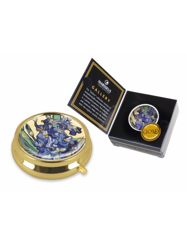 Kieszonkowe puzderko z lusterkiem inspirowane pracą Vincenta van Gogha "Irysy". Zapakowane w ozdobne pudełko prezentowe. Średnica 6 cm