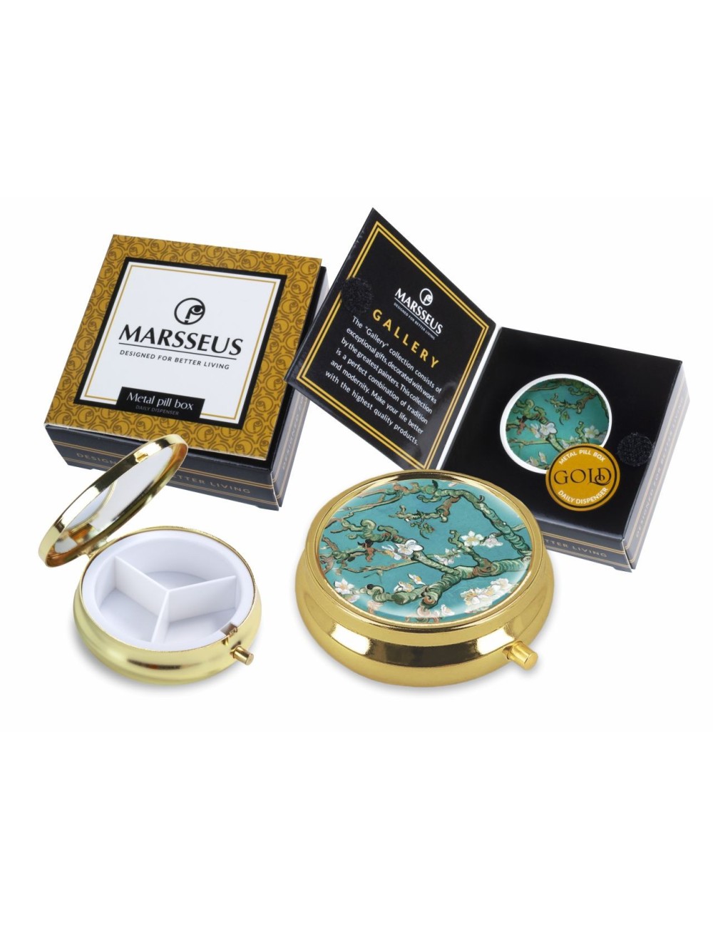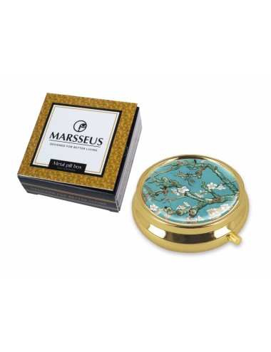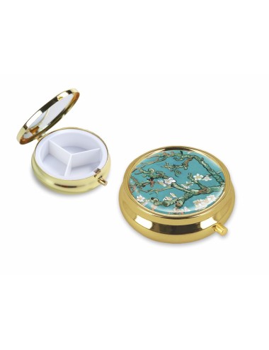 Kieszonkowe puzderko z lusterkiem inspirowane pracą Vincenta van Gogha "Kwitnący migdałowiec". Zapakowane w ozdobne pudełko prezentowe. Średnica 6 cm