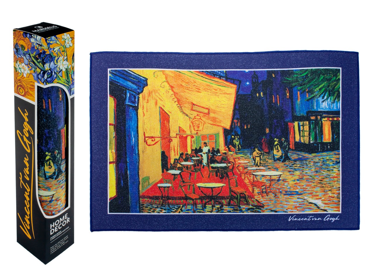 Ozdobna mata stołowa, pełniąca funkcje dekoracyjną oraz ochronną. Motyw inspirowany pracą Vincenta Van Gogha "Taras kawiarni w nocy". Zapakowana w ozdobne pudełko prezentowe.
