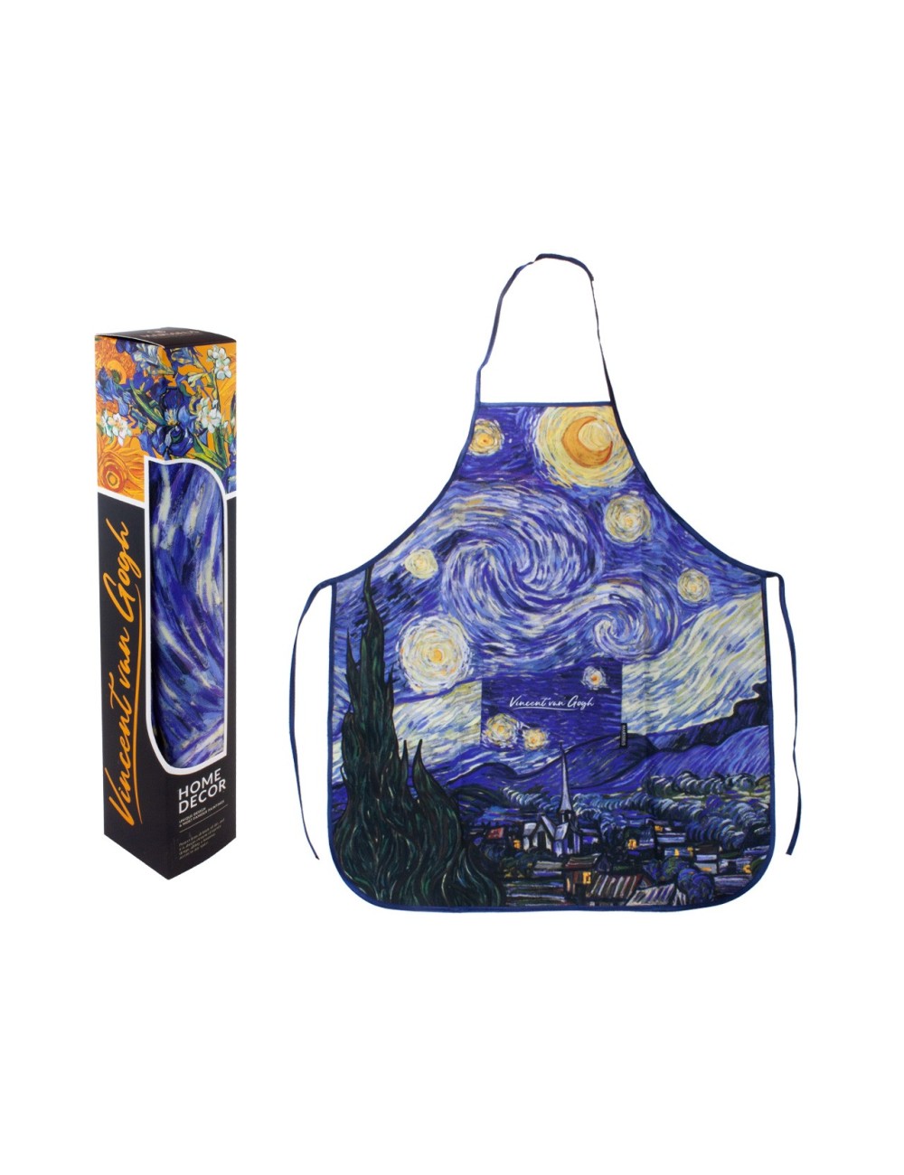 Fartuszek kuchenny z niezwykłym motywem pracy Vincenta van Gogha "Gwiaździsta noc". Zapakowany w ozdobne opakowanie prezentowe. Wymiary 65x73 cm
