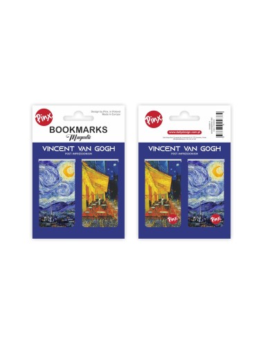 Zestaw dwóch zakładek magnetycznych. Inspirowane dziełami wielkiego malarza Vincenta Van Gogha "Gwiaździsta noc" oraz "Taras kawiarni nocą". Zapakowane w estetyczną folię z kartonikiem. Wymiary 3,5x6 cm *2