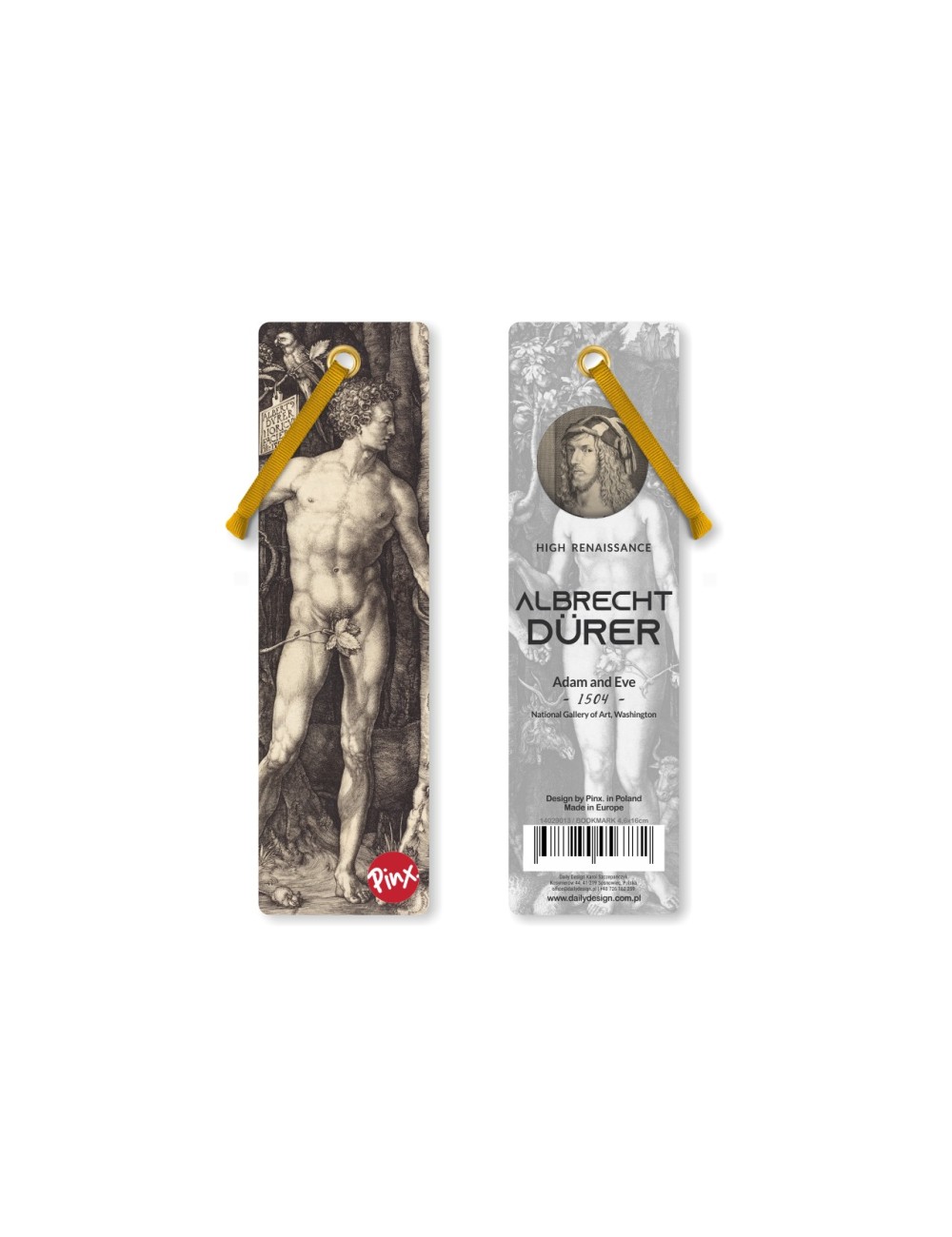 Zakładka do książek inspirowana dziełem wielkiego malarza Albrechta Dürera "Adam i Ewa". Zakładka wykonana z wysokiej jakości materiałów, pokryta folią zabezpieczającą. Zakładka w zestawie z haczykiem oraz ozdobną tasiemką. Wymiary 4,5x16 cm