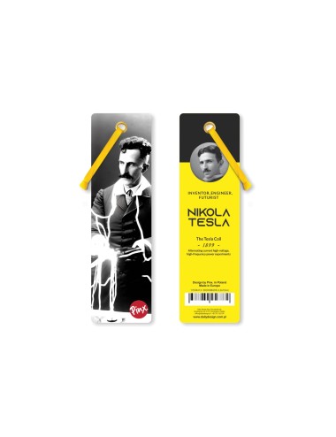 Zakładka do książek inspirowana podobizną wielkiego odkrywcy Nikola Tesla. Zakładka wykonana z wysokiej jakości materiałów, pokryta folią zabezpieczającą. Zakładka w zestawie z haczykiem oraz ozdobną tasiemką. Wymiary 4,5x16 cm